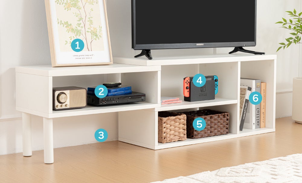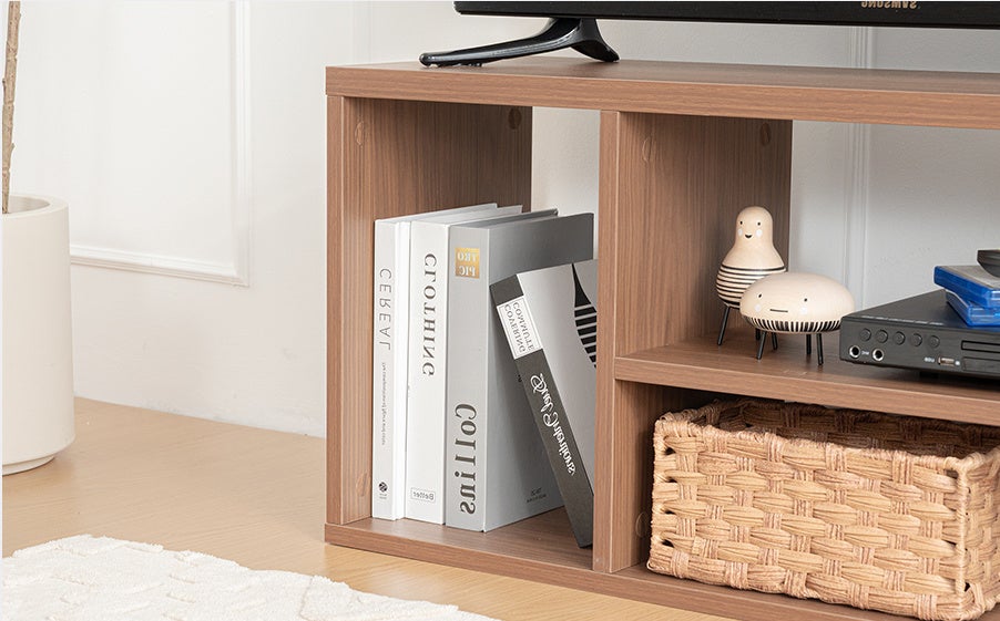 オープン収納を計6箇所備え、AV機器・ゲーム機・書類・雑誌などをすっきり収納可能。背面はフルオープン仕様となっており、配線が容易で、熱がこもりにくい構造です。