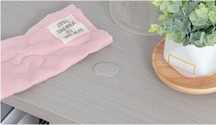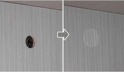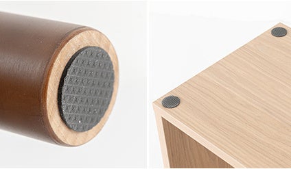 見た目だけでなく、日常使いのしやすさにも配慮しました。天板にはキズや汚れに強いメラミン加工を施し、お手入れはさっと拭くだけ。完成後の見た目をすっきり保てるよう、ネジ穴を隠す専用シールを付属しています。さらに、床へのダメージを抑えるフェルト付きで、賃貸住宅やフローリングのお部屋でも安心してお使いいただけます。