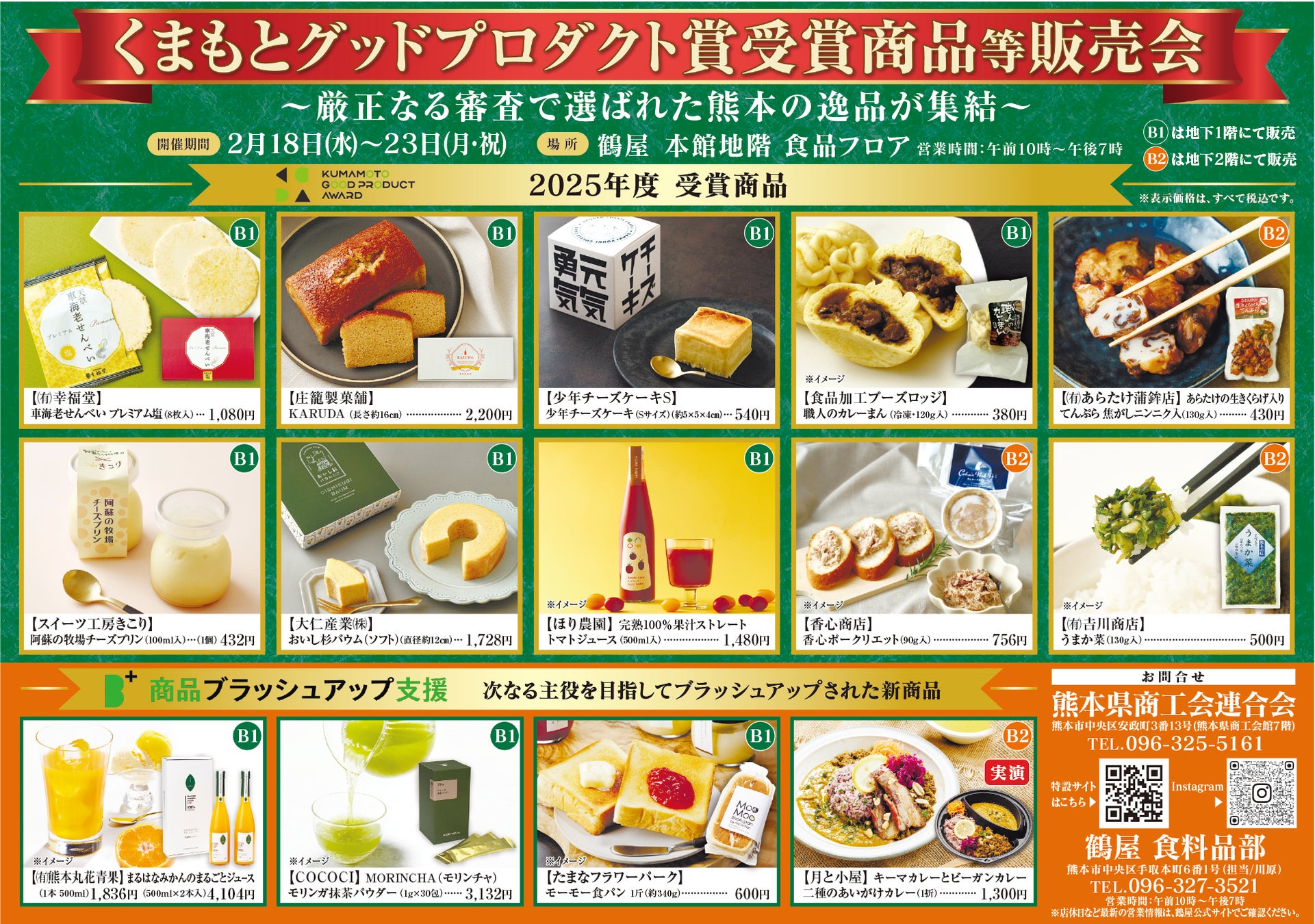 熊本県商工会連合会では、2026年2月18日(水)から23日(月・祝)までの6日間、鶴屋本館地階食品フロアにて「くまもとグッドプロダクト賞受賞商品等販売会」を開催いたします。