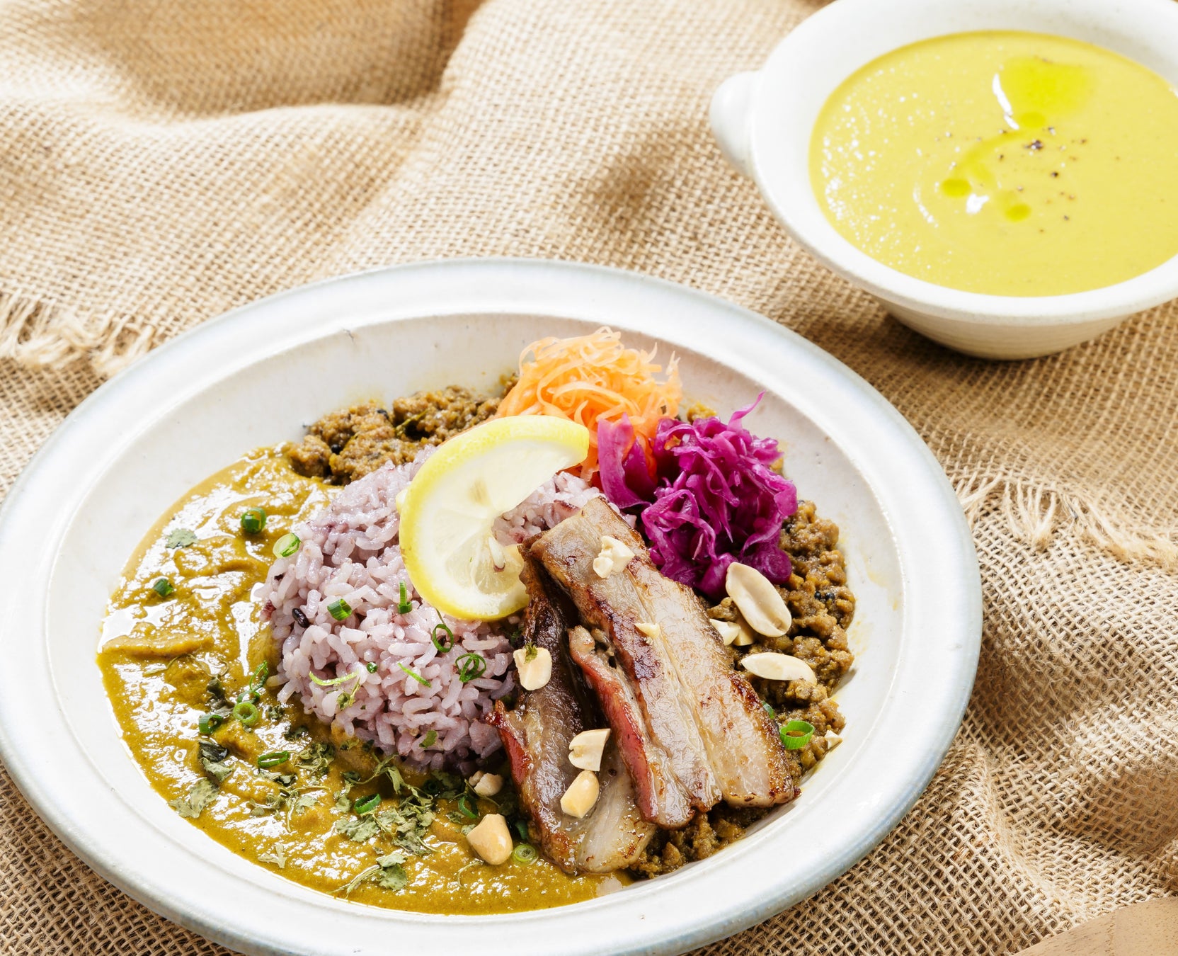 熊本県産豚肉のスパイスキーマカレーと、野菜のビーガンカレーのあいがけです。