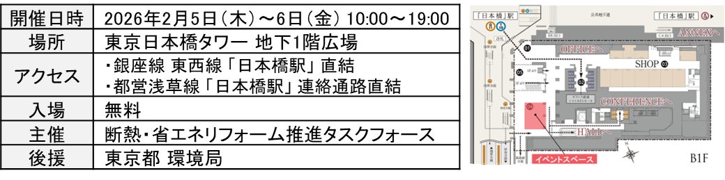 このイベントが、2月5日(木)~2月6日(金)に、東京日本橋タワー地下1階広場に登場します。リフォームや断熱関連のニーズが顕在化していない層、特に戸建て所有者およびファミリー層に向けて、断熱リフォームへの気づきと必要性の理解を促進してもらうための、コンテンツを出展します。