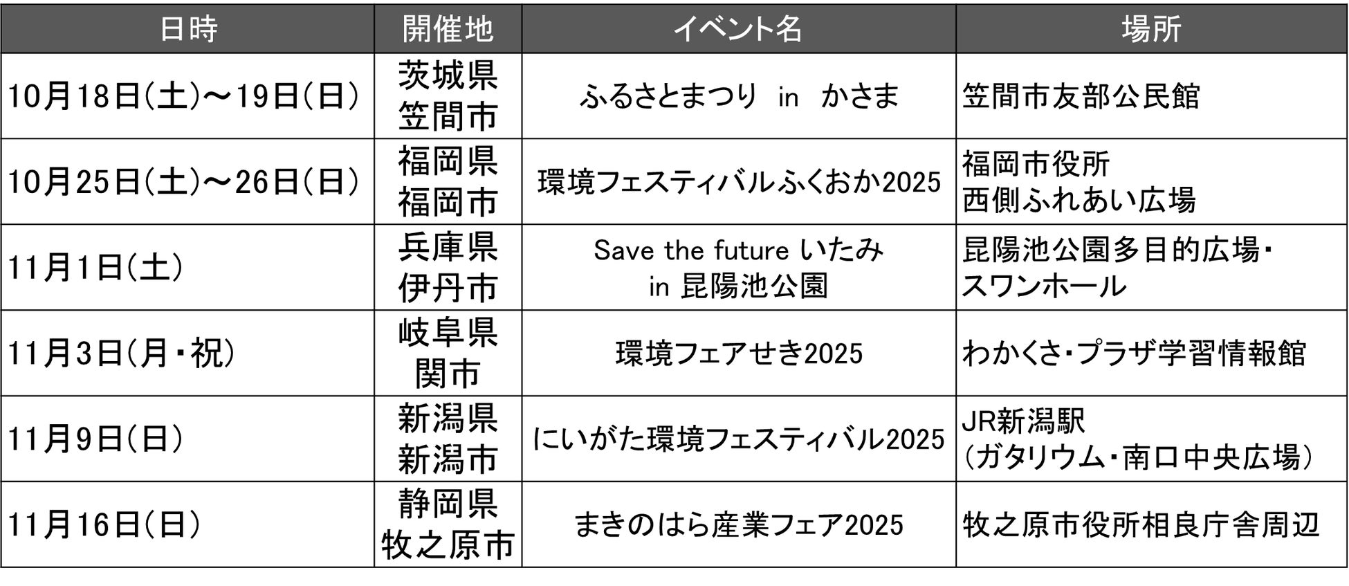 茨城県笠間市の「ふるさとまつり」では約2,900名、 福岡県福岡市の「環境フェスティバルふくおか」では約1,700名に、 兵庫県伊丹市の「save the future いたみ」では約600名に、 岐阜県関市の「環境フェアせき」では約800名に、新潟県新潟市の「にいがた環境フェスティバル」では約500名に、静岡県牧之原市の「まきのはら産業フェア」では約1,500名にご来場いただきました。