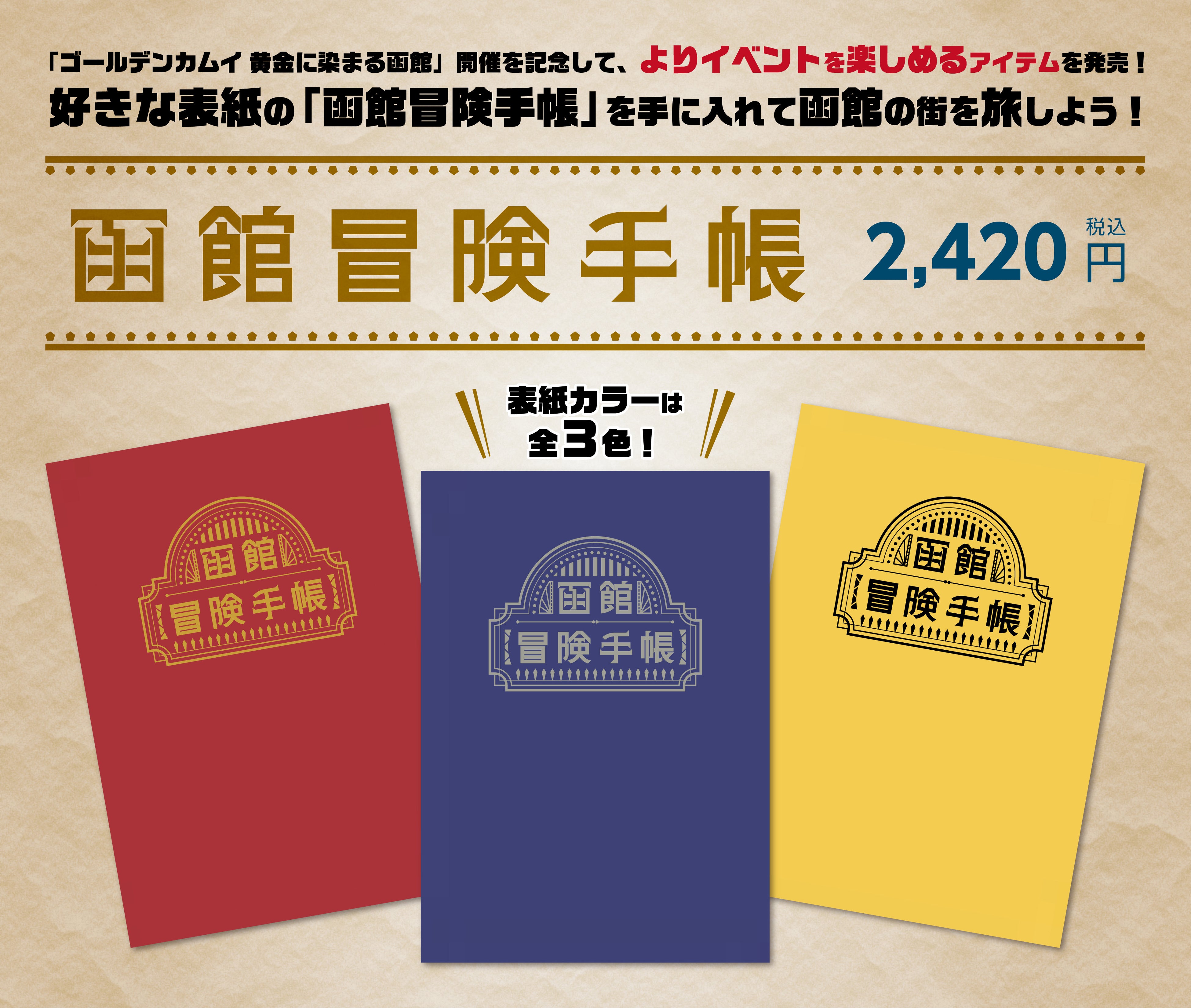 表紙カラーは3色ご用意し、函館の各販売店では記念スタンプを設置します。手帳に旅の思い出を記録し、自分だけの『函館冒険手帳』を完成させよう!