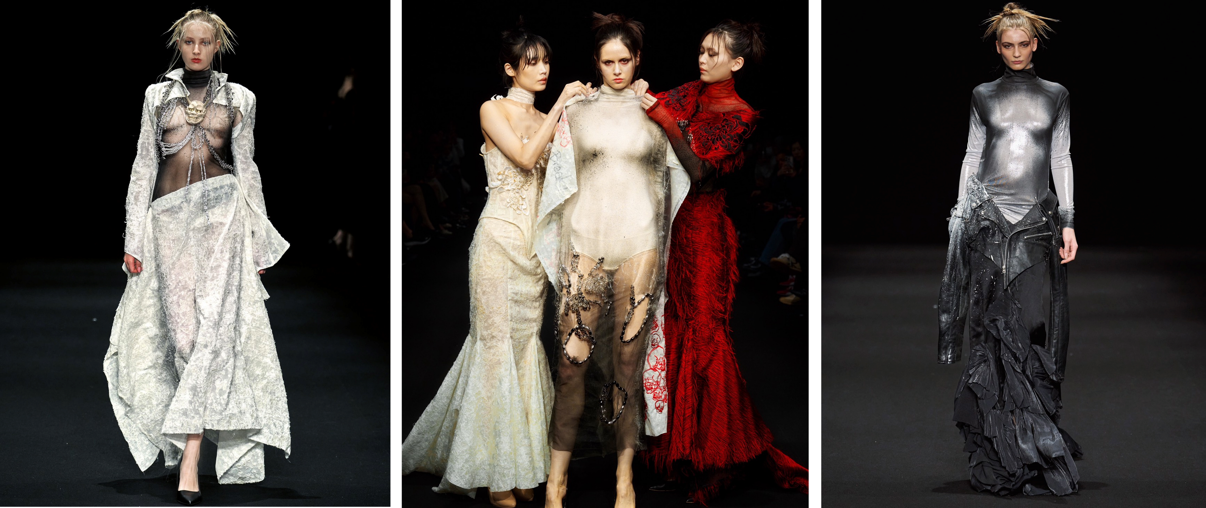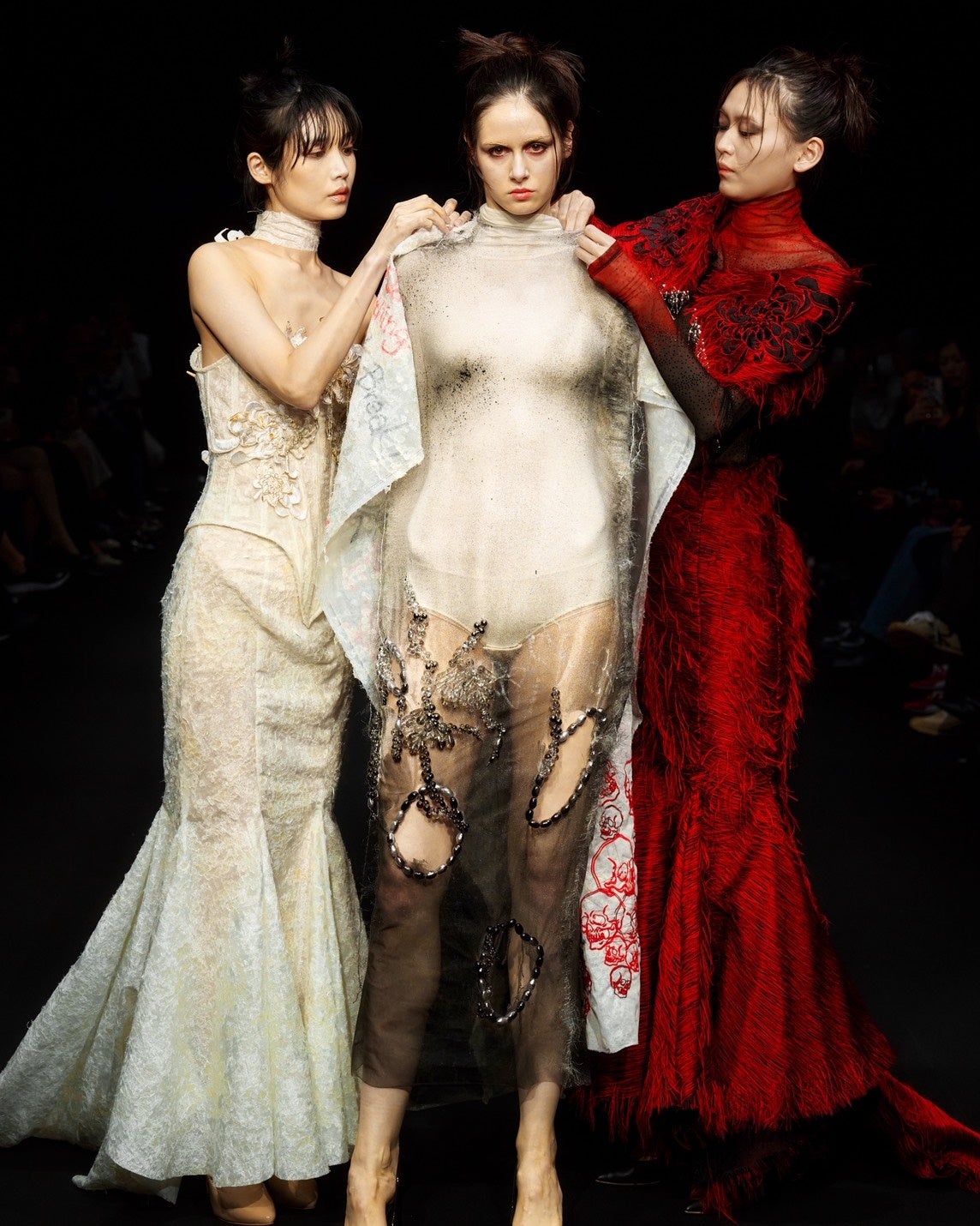 今回のコレクションは生地や般若、そしてビーズに至るまで全てが日本の職人さんの手仕事から生まれています。その中で特に象徴的な赤と白のドレスは、皮膚の記憶(トラウマ)から身動きができなくなってしまっていた自分を救ってくれた「美しく強い日本文化」(般若や浮世絵、手仕事に対して誇りを持つ職人の皆様)を示していました。