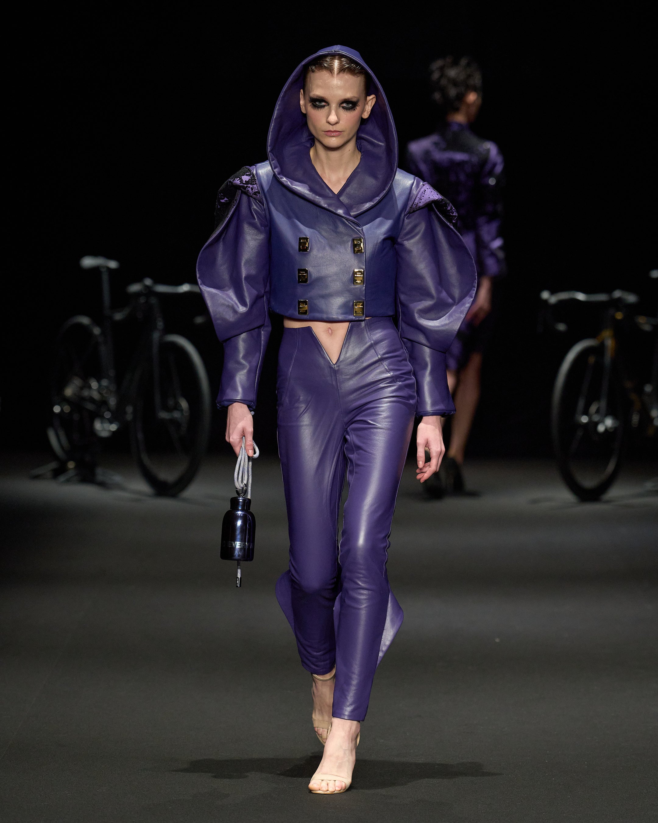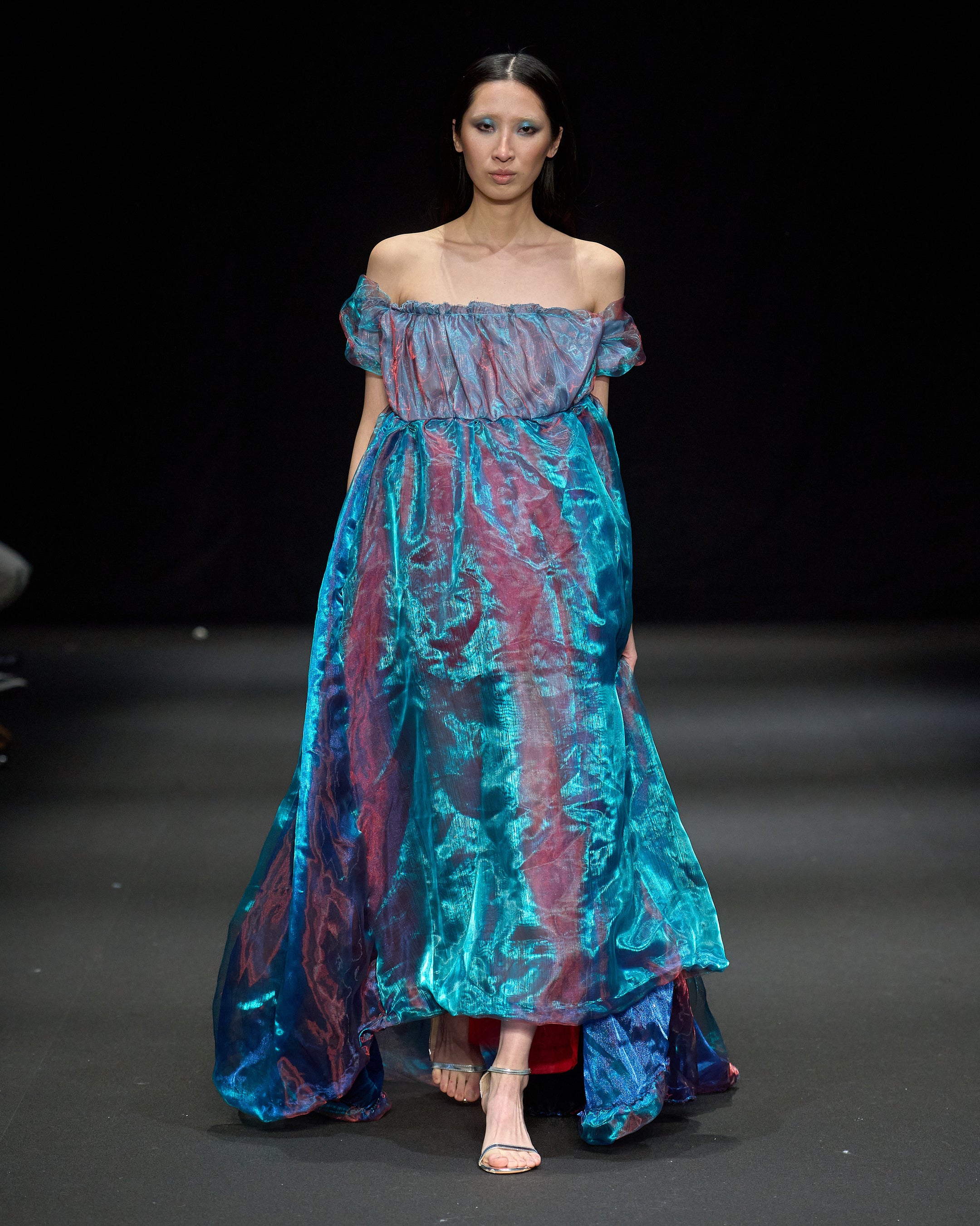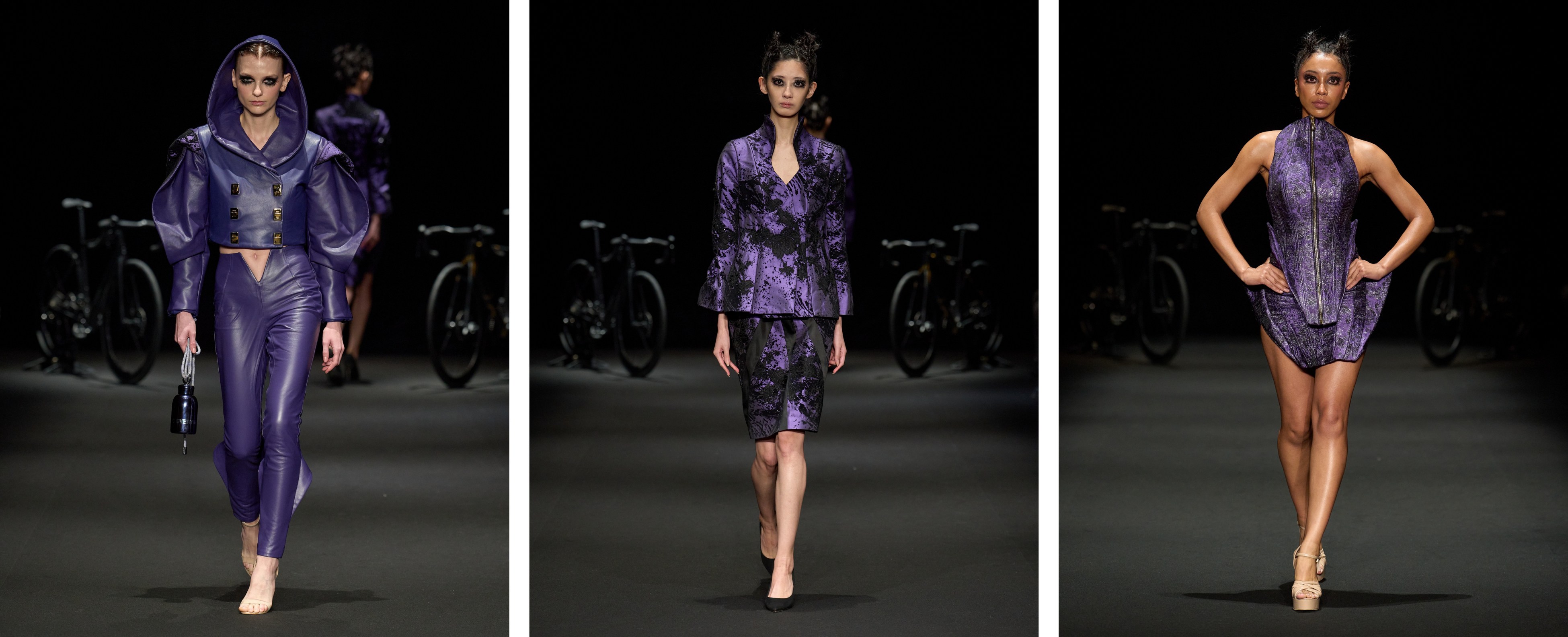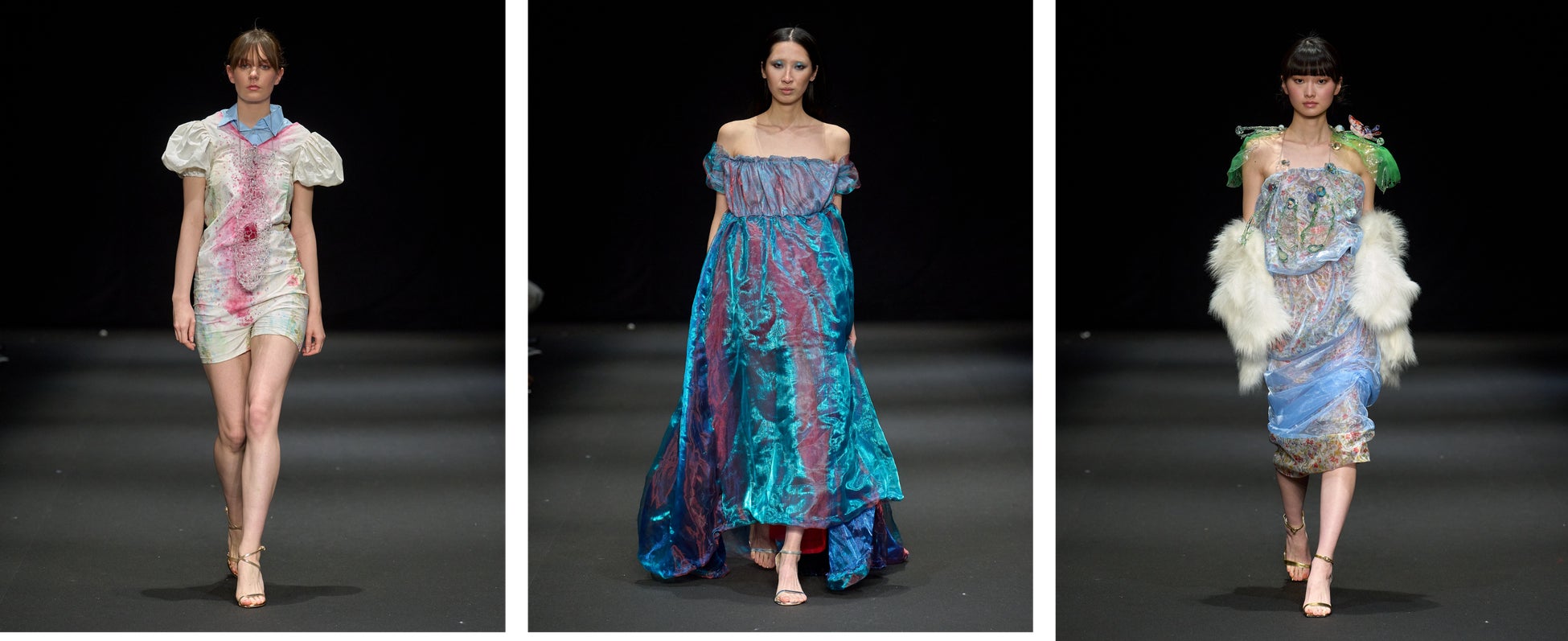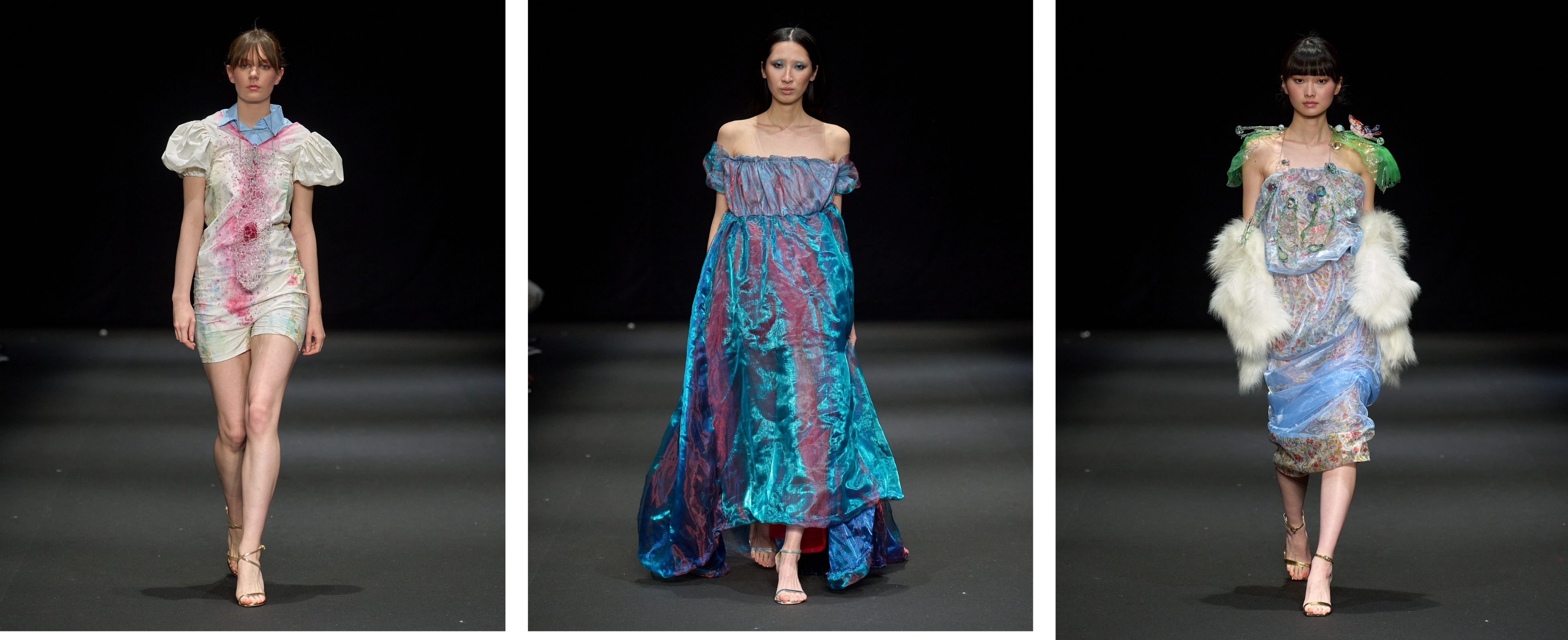 衣服を身体に触れる「空間芸術」と捉え、自身の内面を投影したウェアラブル・アートを展開するMarika Suzuki。自身の半生をテーマに据え、熱処理を施した廃棄ペットボトル、ダメージのある着物、そして廃棄予定だったテキスタイルを使用し、ファンタジー映像からインスピレーションを得たコレクションを披露しました。廃棄素材に残るダメージや使用感などの痕跡をアートに昇華させ、人間が持つ脆弱性などとの共生を表現し、被服の世界で新たな視点を発信しています。