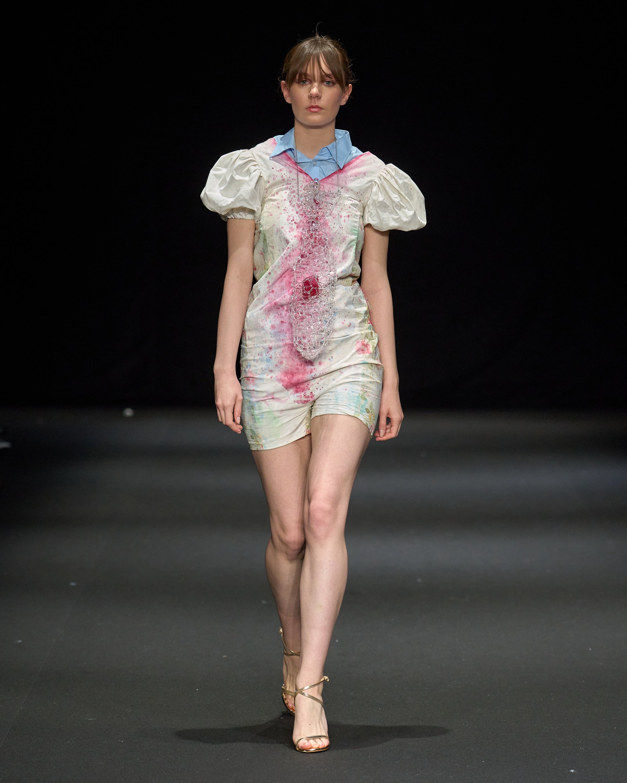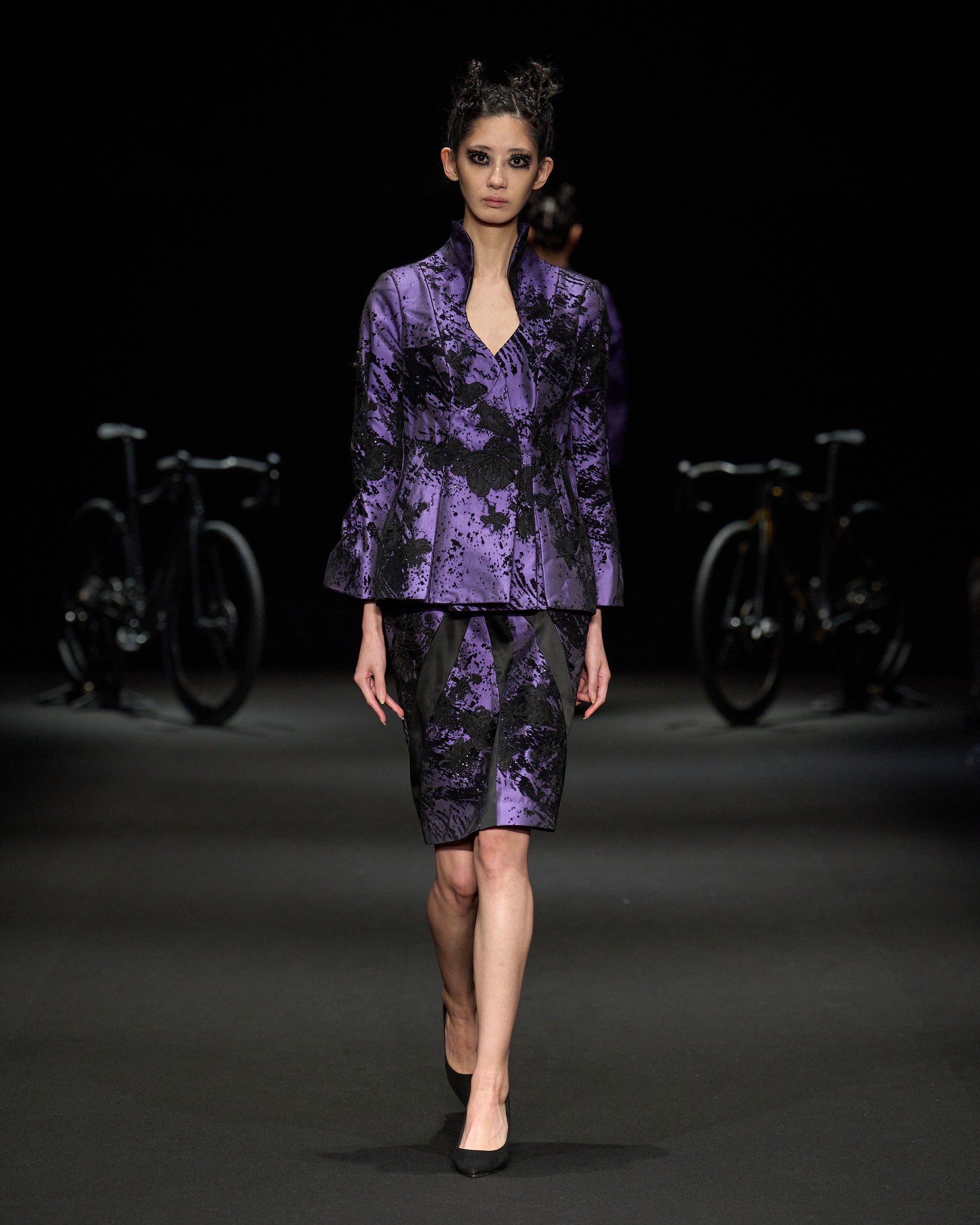 テキスタイル、刺繍、クチュール、現代アートを横断的に扱い、日本を拠点にNYやアジアでコレクションを展開するAo Miyasaka。本コレクションのテーマは「肉声」。2月にニューヨークで発表した内容に新たなルックを加え、日本語という文脈だからこそ伝えられるノンフィクションのビジュアル表現として再構築された。グラフィティが持つ公共的な破壊や存在証明の意味と、刺繍が象徴する修復や祈りといった日本的な身体観を重ね合わせ、身体に刻まれた記憶の可視化を試みている。美しさだけにとどまらず、観る者の感情に強く訴えかけるビジュアルアートとして、現代社会におけるファッション表現の可能性を提示するコレクションとなっている。