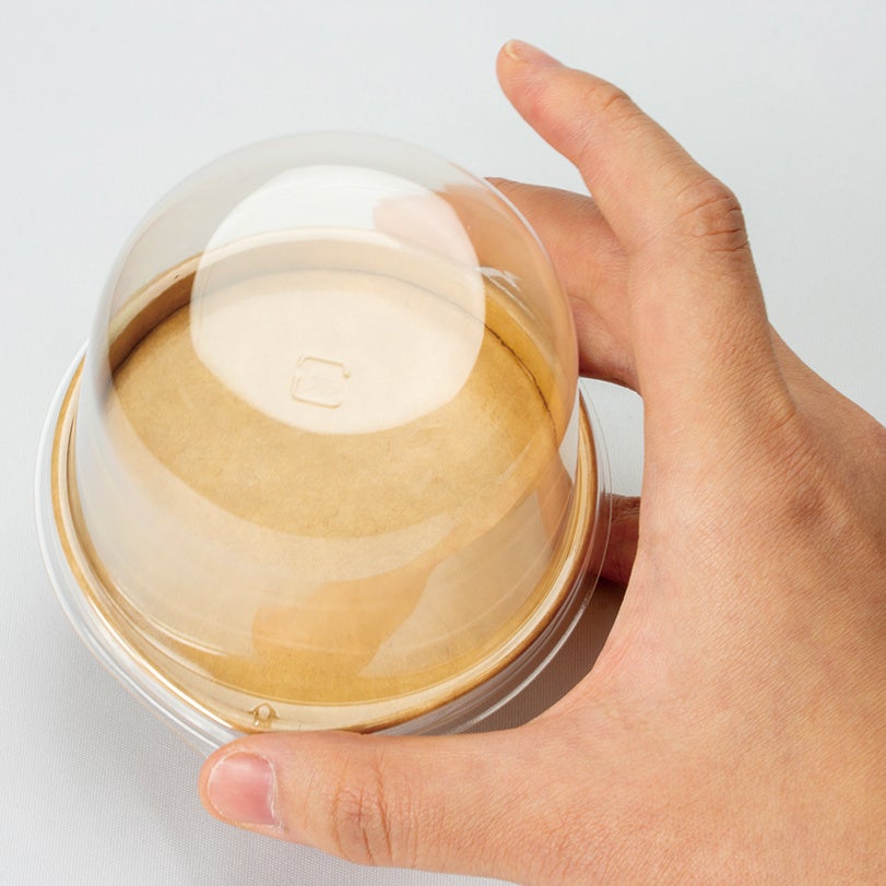 紙製でありながらインジェクショントレーのようにしっかりとした縁があり、持ちやすさに配慮。高台付きの設計で、お菓子のボリューム感を引き立てます。柔らかな風合いとクラフト紙特有のモダンな印象を併せ持ち、環境にも配慮したSDGs対応トレーです。