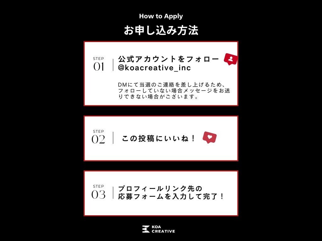 KOA CREATIVE公式SNS @koacreative_inc InstagramまたはXのプロフィールリンクからご応募ください。