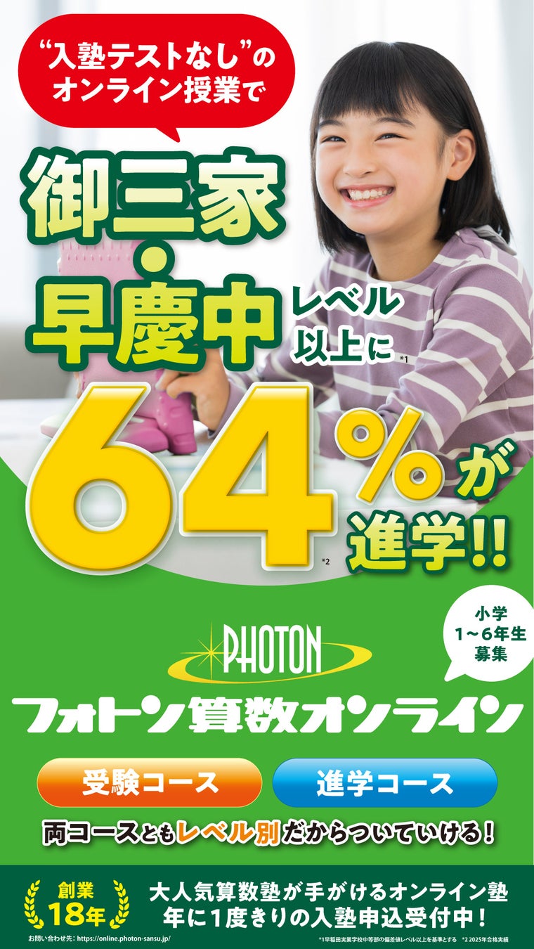 そうしたお声に応えるために開設したのが、「フォトン算数オンライン教室」です。オンライン教室では「入塾テストなし」「対面教室と同一カリキュラム」「いつでもどこでも受講可能」という学習環境を整え、全国の子どもたちがフォトンの算数教育を受講できるようになりました。オンライン受講生も第一期生が「御三家・早慶中レベル以上に64%が進学」という実績を上げております。