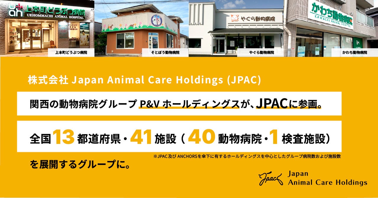 株式会社Japan Animal Care Holdings(以下、JPAC)は、動物病院グループであるP&Vホールディングス株式会社(以下、P&V)がJPACグループに参画したことをお知らせいたします。
