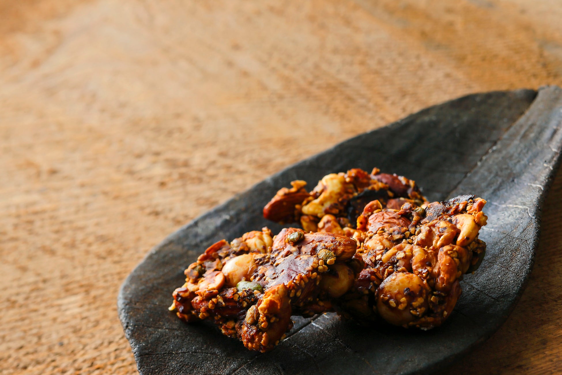 「果柯」の土台となる「果椒」は、数種の木の実や、自然の甘みが優しいドライフルーツに、山椒をしのばせ、歯ざわりよく寄せ固めた和久傳の定番菓子です。