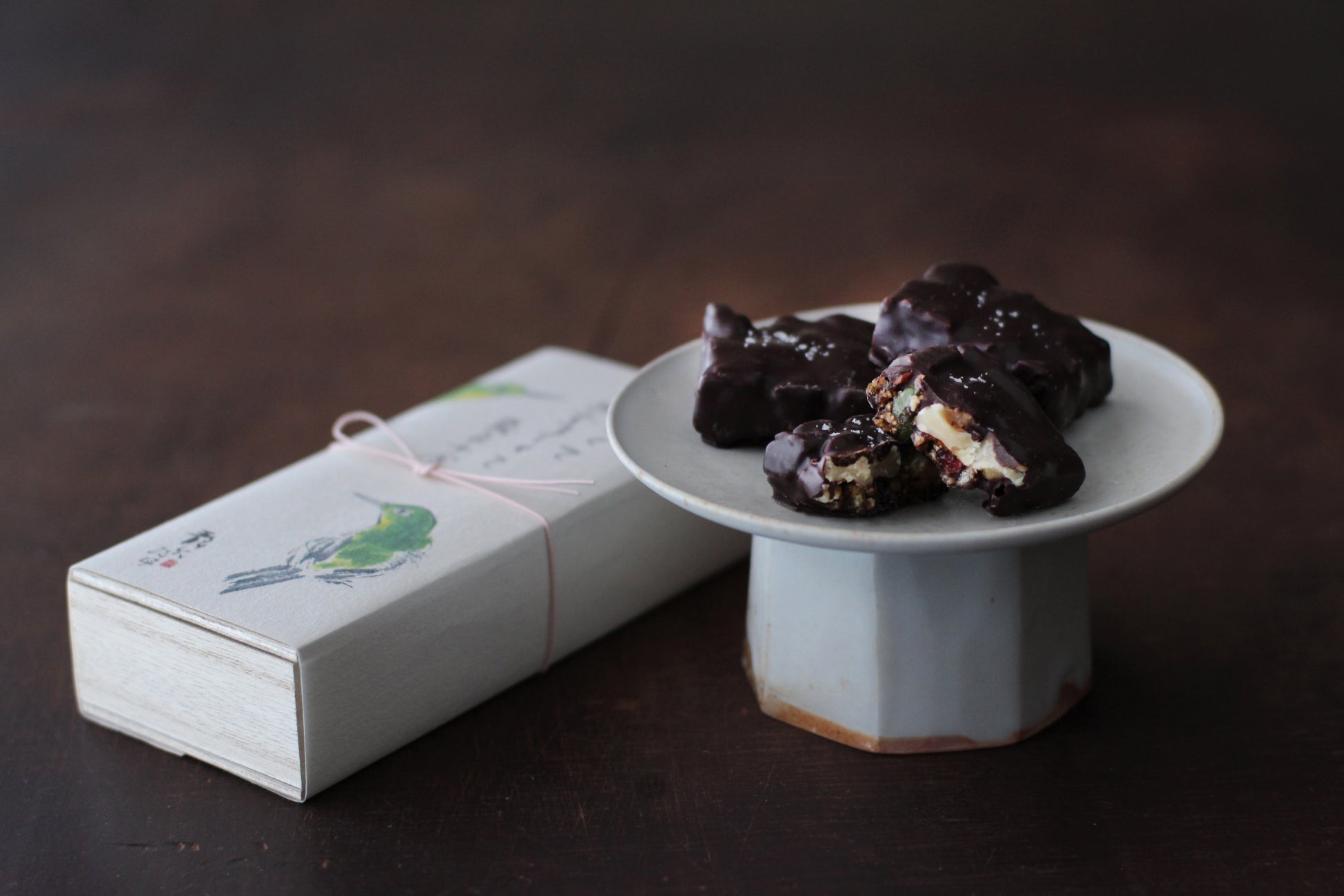 「果柯」は、和久傳の定番菓子「果椒」にチョコレートの衣をまとわせた、季節限定の一品です。ダークチョコレートと京丹後の天然塩が、木の実やドライフルーツの味わい、実山椒の凛とした香りを引き立て、輪郭のある余韻へと導きます。