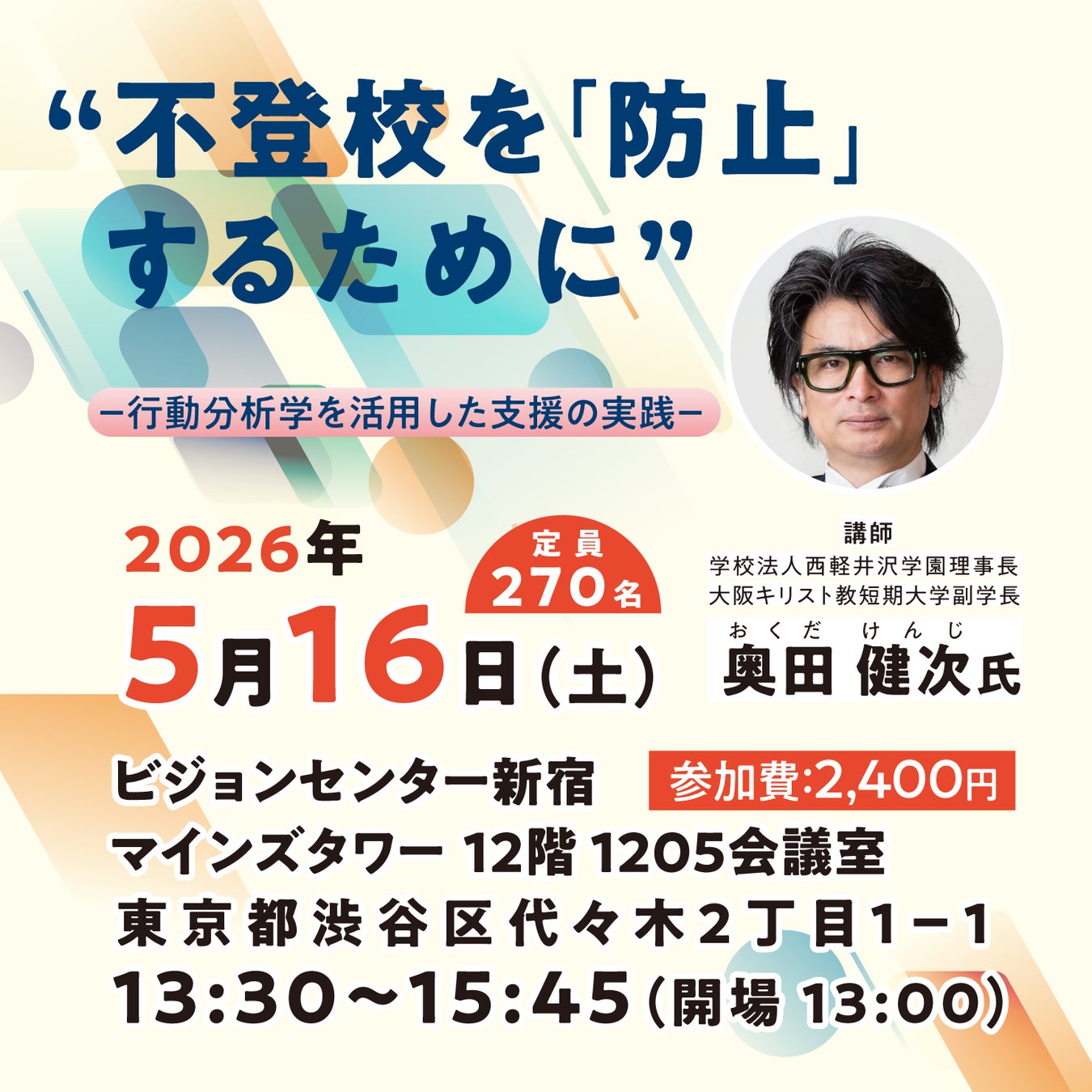 不登校の「防止」に焦点をあて、行動分析学に基づく子どもとの関わり方を学びます。日常の中でできる実践的な工夫を、奥田先生の豊富な事例とともに紹介します。ユーモアと愛情に満ちたお話をぜひお楽しみください。