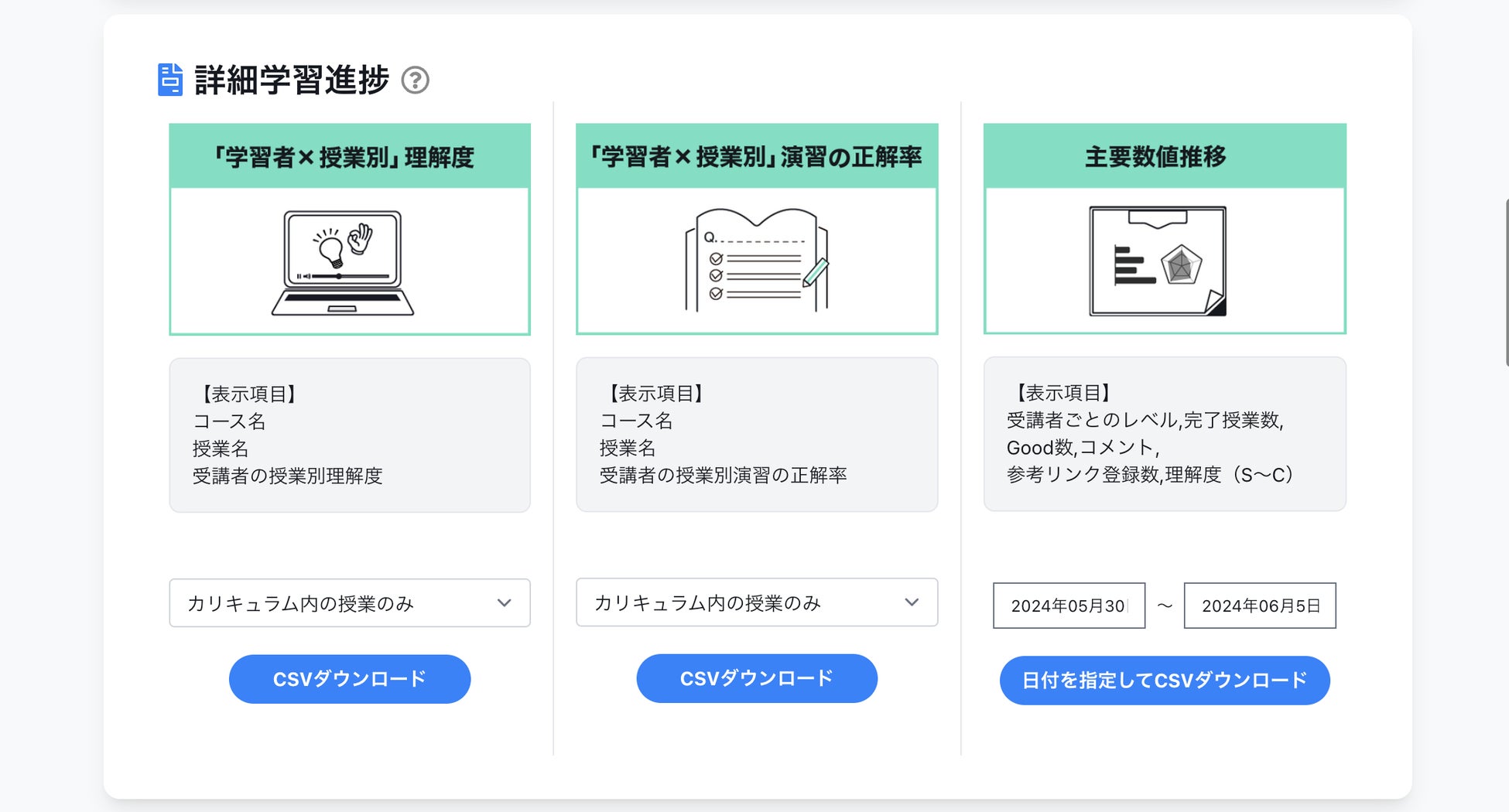 学習進捗・理解度の可視化、スキルの見える化、週1の進捗レポート(メール)、テスト自動生成、CSVでの確認、カリキュラム変更のしやすさなど、管理者の運用負荷を大幅に削減。さらにサービス上でのQ&Aにより、“分からない”で止まらない学習を支援します。加えて、自社動画をサービスに掲載し、テスト設定もできるため、教育プラットフォームとして拡張利用も可能です。