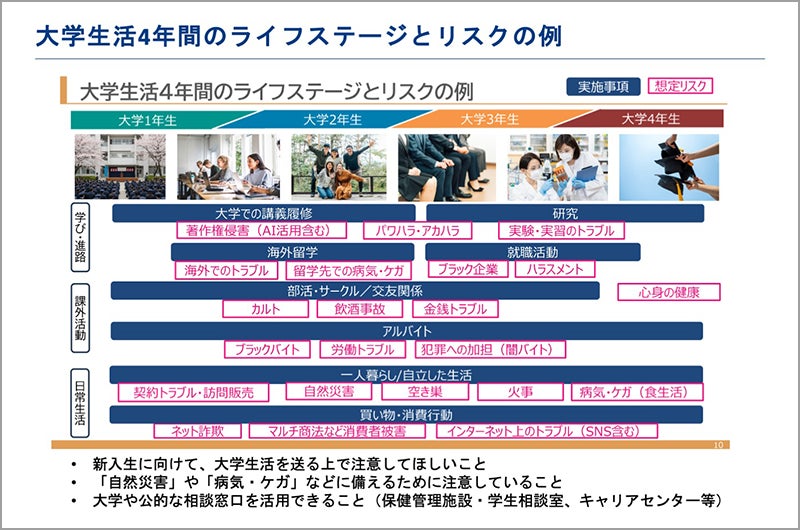 学生生活実態調査や学生総合共済の給付事例、学生生活110番の電話相談やサポート事例をもとに大学生活のリスク(困りごと)を読み解いています