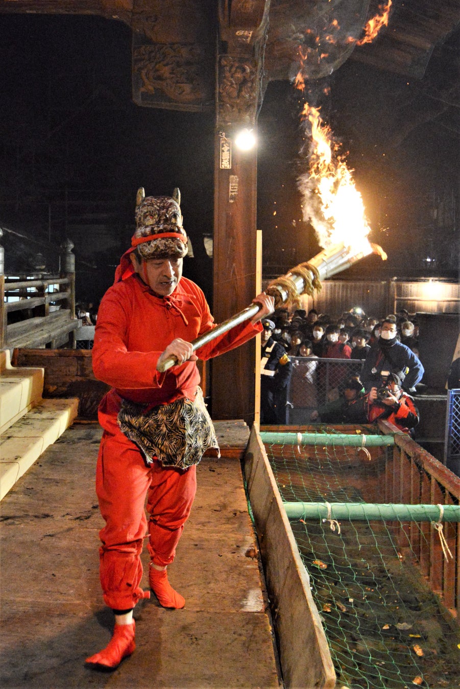 真っ赤に燃え盛る大松明の火は、大護摩供で焚かれた火を移したもので、大変迫力があります。赤鬼が勢いよく振り回すこの松明の火の粉を浴びると、その一年間は息災に過ごすことができるといわれ、赤鬼が激しく乱舞する姿に境内で待ち構えた参詣客から大きな歓声が沸き起こります。