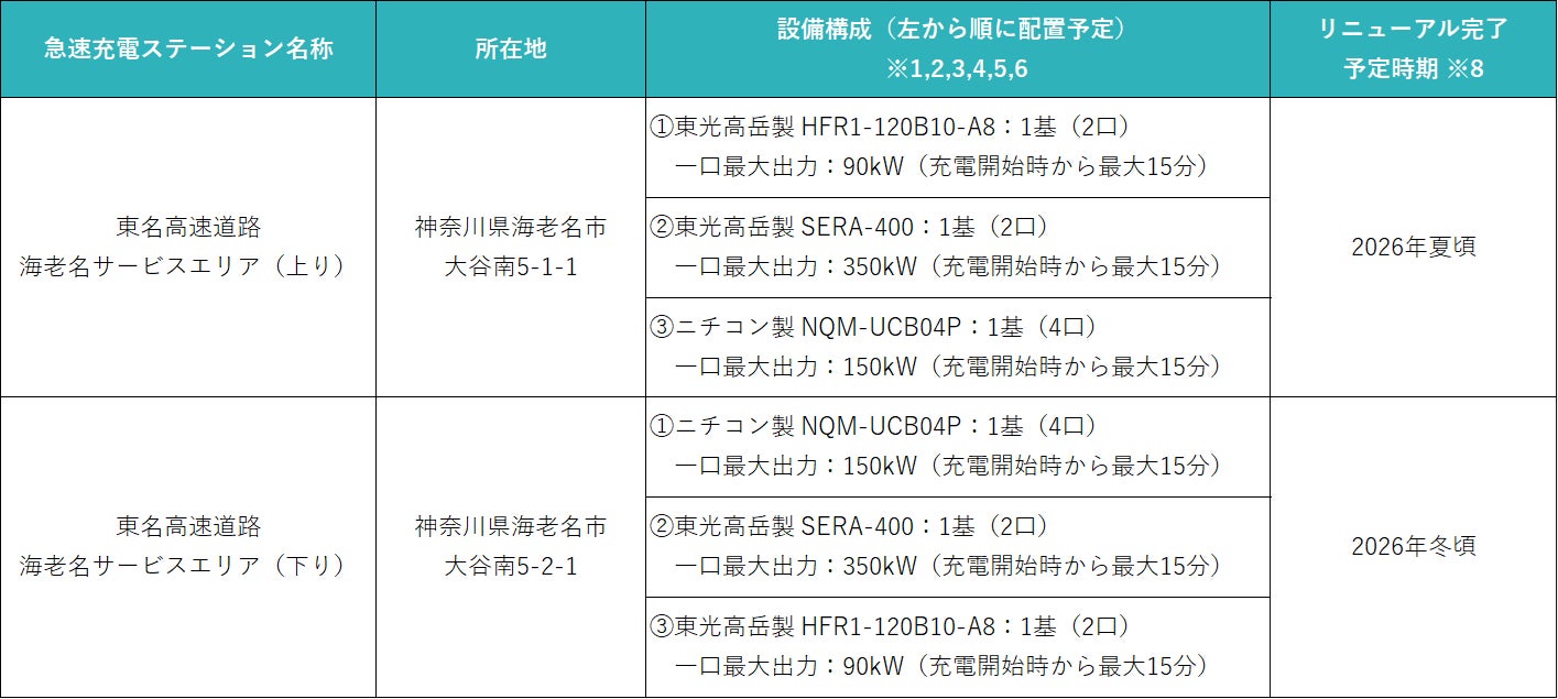 海老名サービスエリア(上り)急速充電ステーションは2026年夏頃、海老名サービスエリア(下り)急速充電ステーションは2026年冬頃のリニューアル完了(※8)を予定しております。