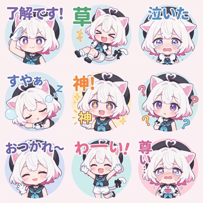 「参照画像と同じ画風で、キャラの表情スタンプを9種類作ってください。全部ちがう表情で、チャットで使いやすいものにしてください。」