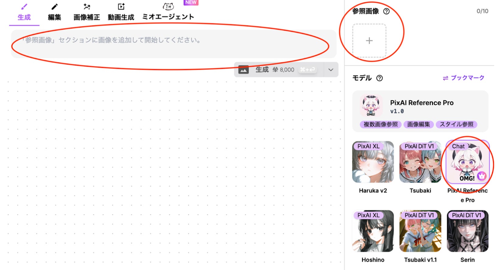使い方は生成画面でPixAI Reference Proを選択した状態で、参照画像を任意の枚数アップロードし、それに対するプロンプトを入力するだけです。赤丸で囲った部分の操作だけで簡単にご利用いただけます。