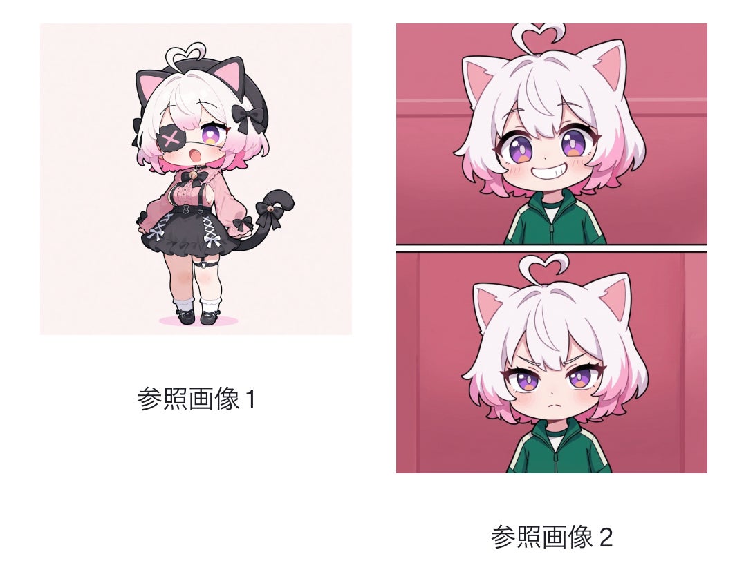 参照画像1のキャラクターをそのまま参照画像2の2コマ漫画に使いたいといった場合に使える機能です。