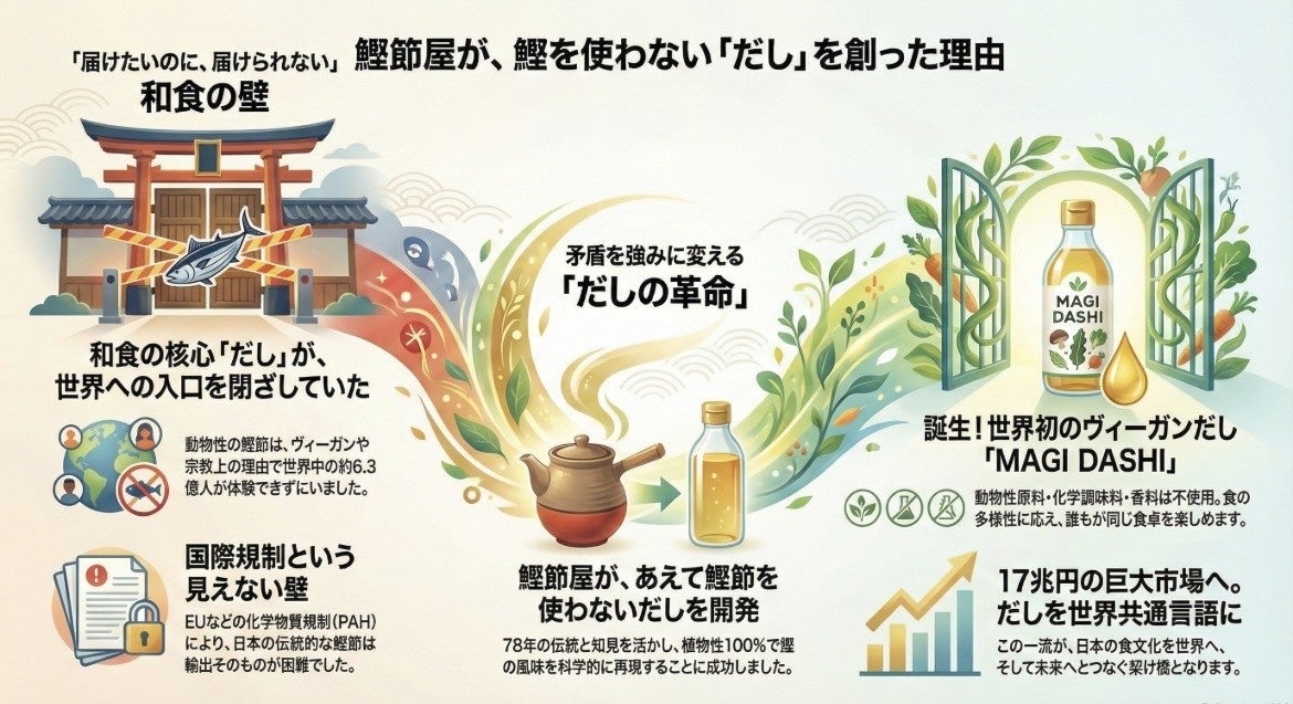 「MAGIDASHI」は、創業78年の老舗が持つ「合わせだしの黄金比」を、最新のプラントベース技術で再現した革新的なプロダクトです。