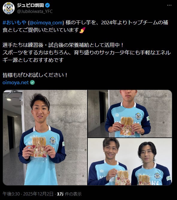 このたび、2026年1月にジュビロ磐田の公式Xにて、干し芋が補食の一例として活用されている様子が発信されたことをきっかけに、改めて本取り組みを紹介するプレスリリースを発信いたしました。