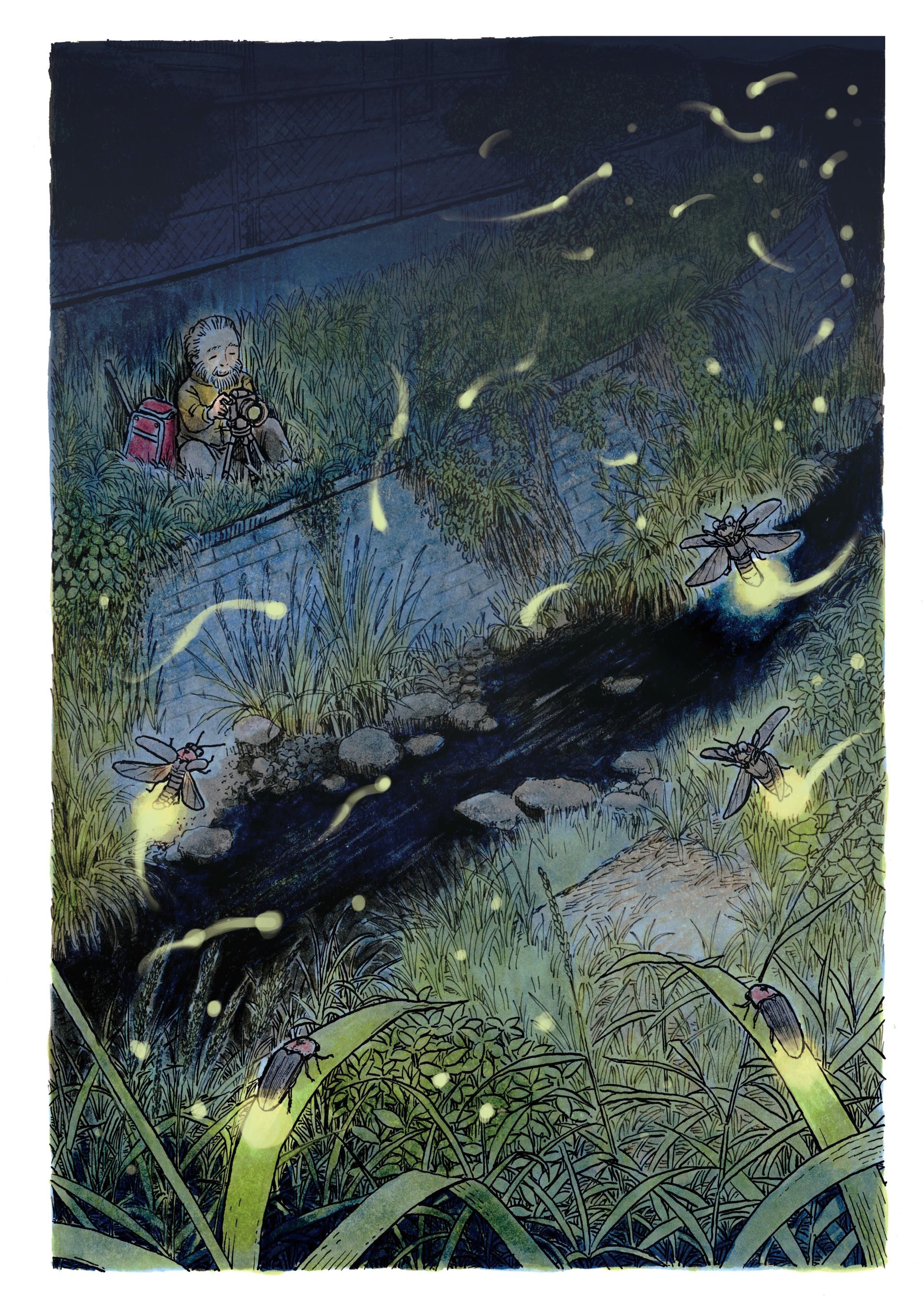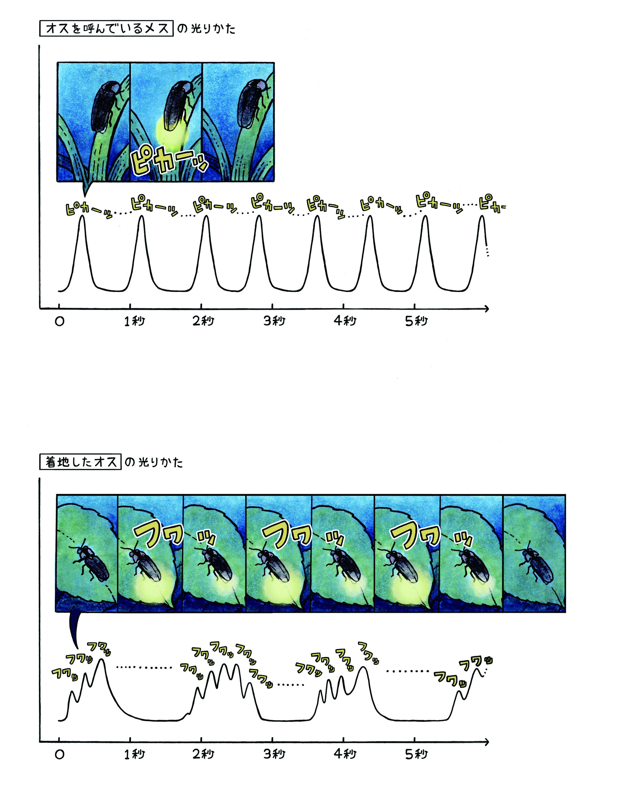 発光生物の専門家である大場教授が、ホタルの光り方をオノマトペ(擬態語)で言語化。さらに、サイエンスイラストレーターの安斉俊氏が、オスのヘイケボタルが見せる繊細な「またたき」を科学的に正確かつ美しくビジュアル化しました。