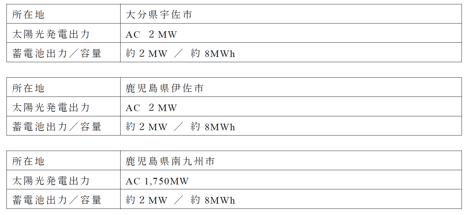 今回運転を開始した全3施設の合計太陽光発電出力は約6MW、蓄電池容量は合計約25MWhであり、年間想定発電量は約700万kWh(一般家庭約2,000世帯相当※5)を見込んでいます。各施設の概要は以下のとおりです。