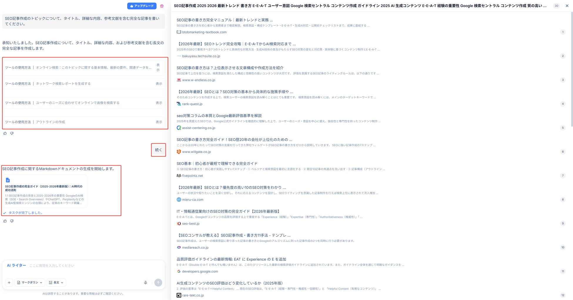 ステップ3. 内容に応じて、AIが関連情報や参考資料を自動でリサーチします。必要な参考文献、画像、アウトラインを生成します。確認した後、「続く」を選択します。