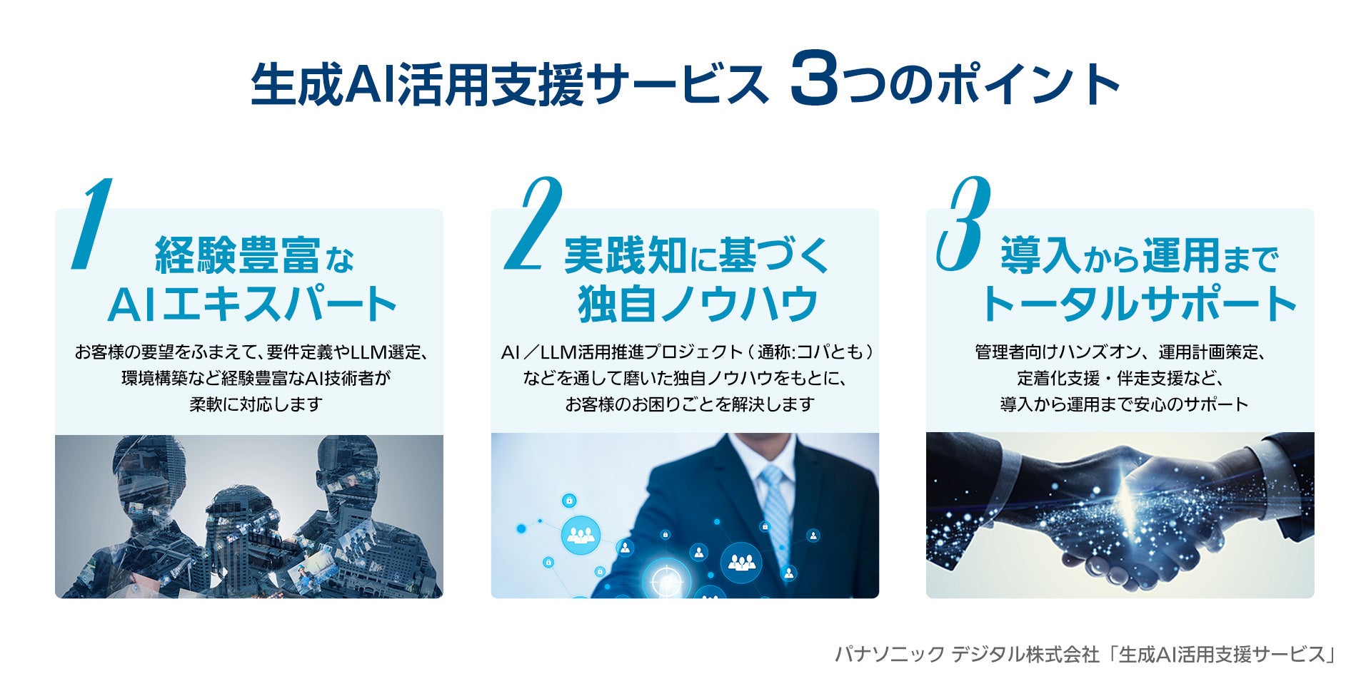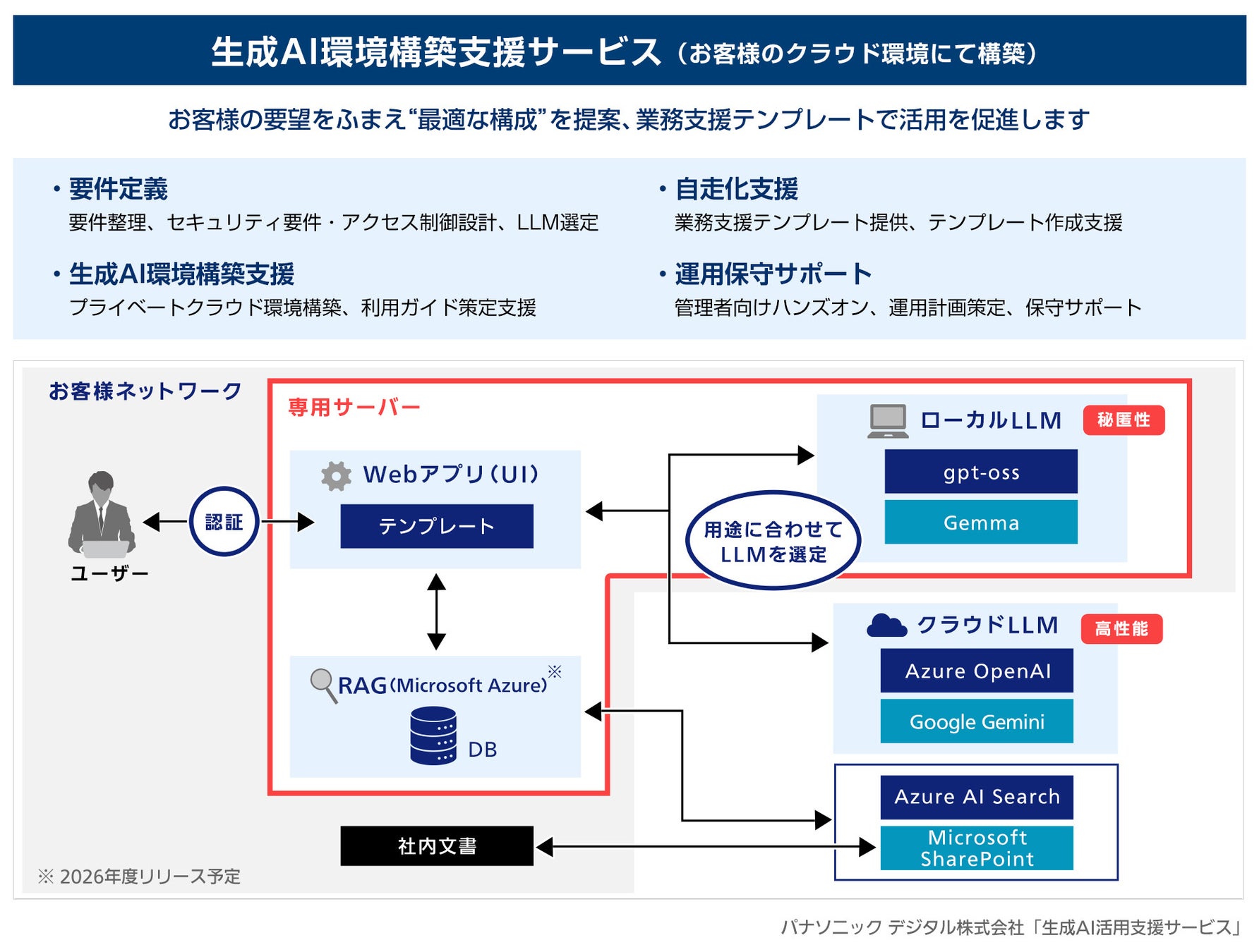 パナソニック デジタル株式会社(本社:大阪府、代表取締役 社長執行役員:阿部 裕)は、2026年3月に生成AI環境の構築から運用・保守、利活用促進までを一気通貫して支援するサービスの提供を開始しました。