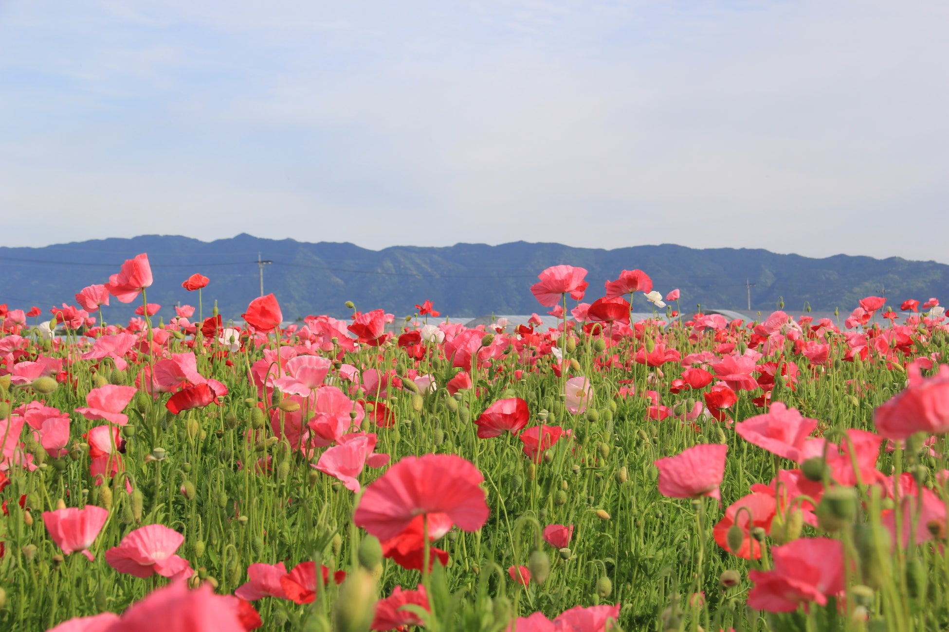 小郡市光行の田園地帯に、約100万本のポピーが咲き誇ります。当日は地元の特産野菜などの販売も行われます。ポピーの見頃は5月上旬~中旬です。
