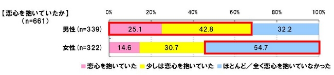 ころ、男性は「恋心を抱いていた」25.1%、「少しは恋心を抱いていた」42.8%、「ほとんど/全く恋
