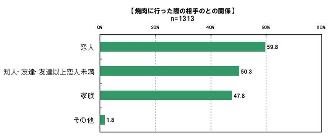 異性と二人きりで焼肉に行った際の相手との関係を聞いたところ(複数回答)、恋人59.8%、知人/友