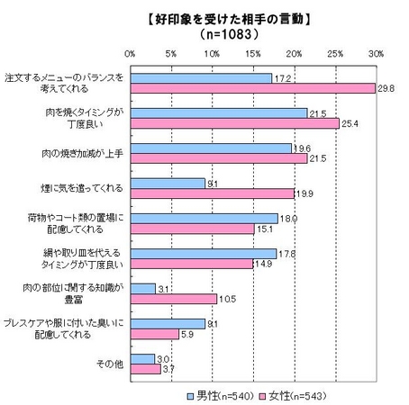 ランスを考えてくれる」29.8%、2位「肉を焼くタイミングが丁度良い」25.4%、3位「肉の焼き加減が