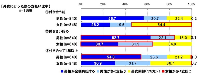 う」22.1%、3位「男女同額(ワリカン)」15.0%となり、女性は1位「男女同額(ワリカン)」34.8%、