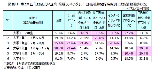 採用活動の解禁時期を定めた「就活ルール」が廃止される前の2019年調査結果と比較すると、「大学2年生までに就職活動を開始」(25.2%)は、2019年調査時(16.8%)よりも9.4ポイント増加しており、就職活動の早期化が顕著に表れています。(図表G)