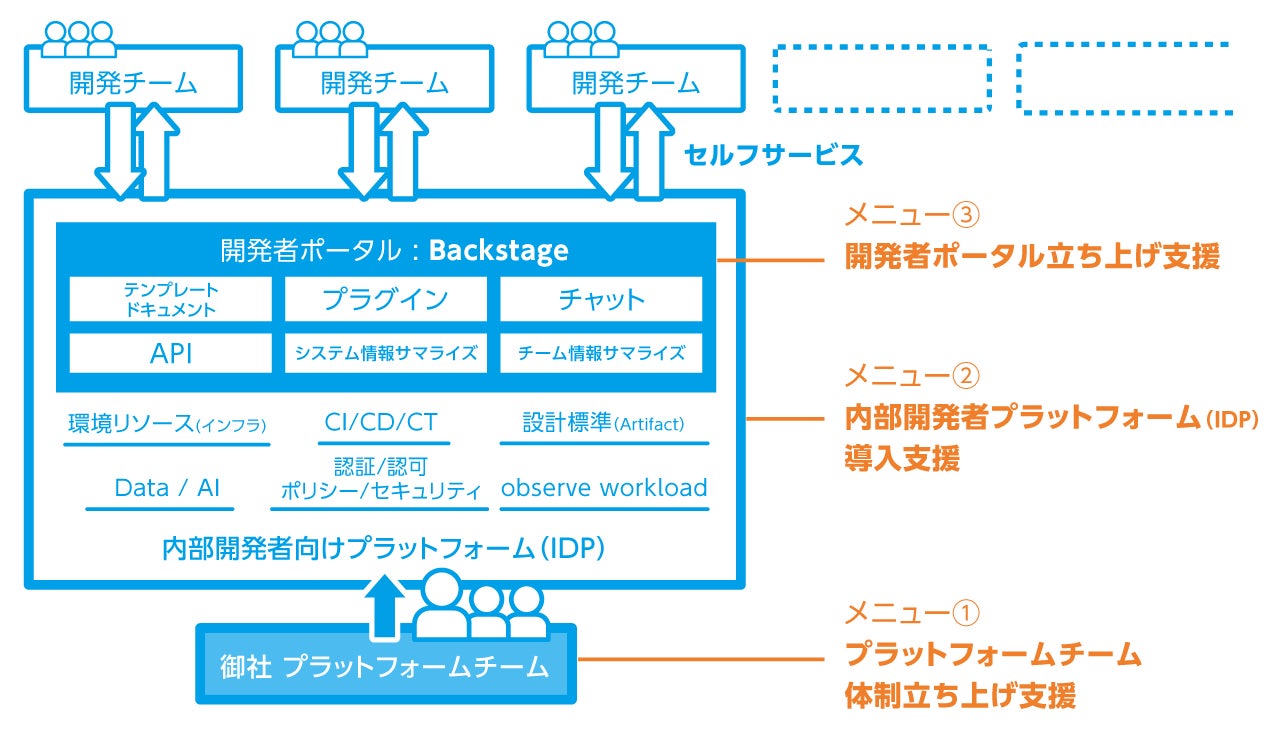 本サービスは、プラットフォームエンジニアリングを実現する体制作りや開発プラットフォームの構築(IDP)、保守を導入先企業に並走型で支援するもので、最短3ヶ月からプラットフォームエンジニアリングの開発体制の確立や内製化が可能です。