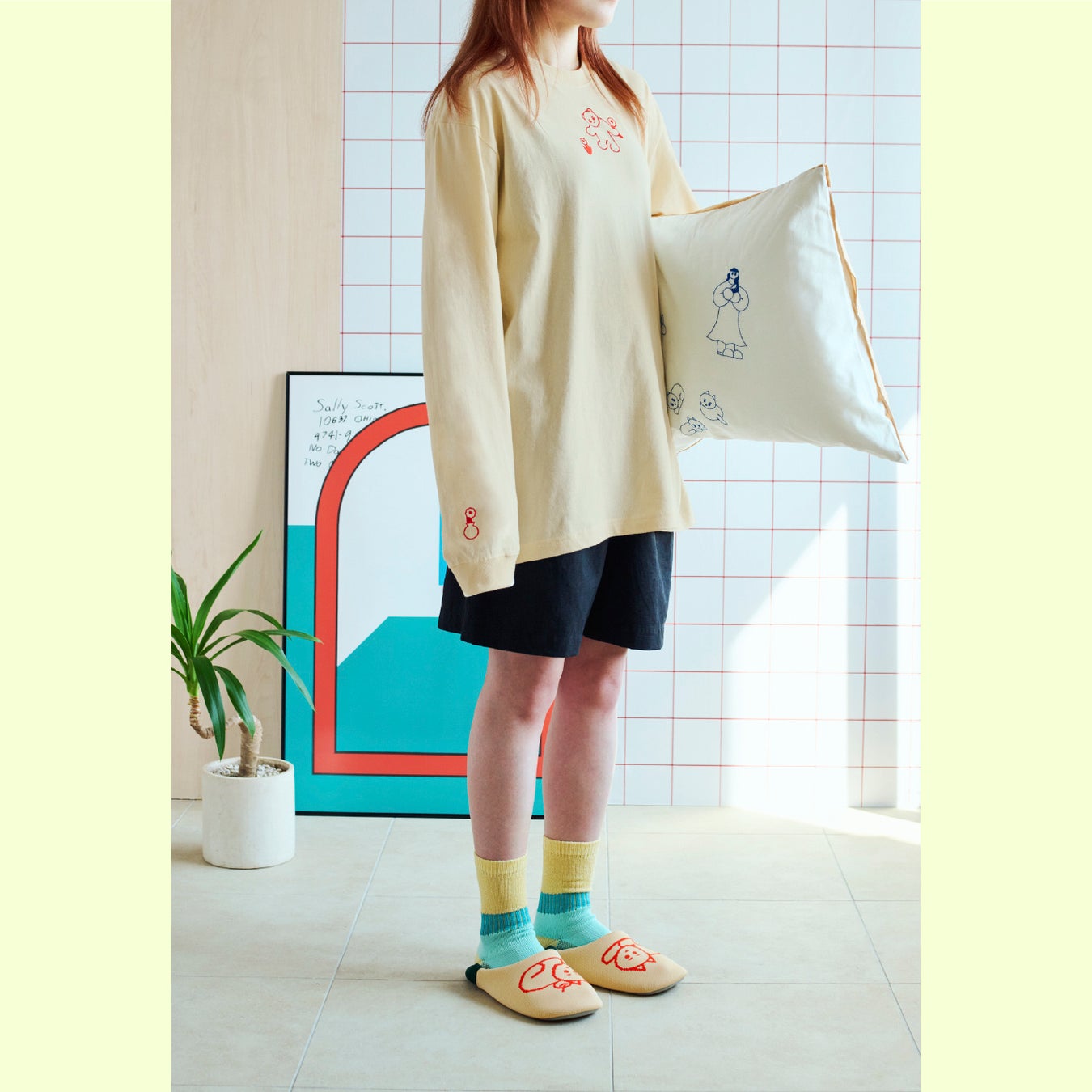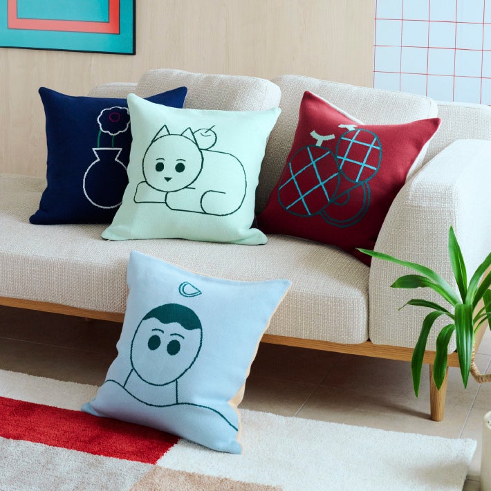 普段は印刷物やwebサイトのデザインをしています。今回は普段デザインしているものとは全く違うインテリアアイテムということで、データから仕上がりへのイメージが難しく、unicoさんには何度も助けていただきました。パソコンで作った無機質な線に、ニットや刺繍などの質感が加わったことで全く違った印象となり、どのアイテムも本当に愛おしく感じています。皆様のお部屋の中にキャラクターたちがお邪魔して、一緒に楽しい時間を過ごせることを楽しみにしております。