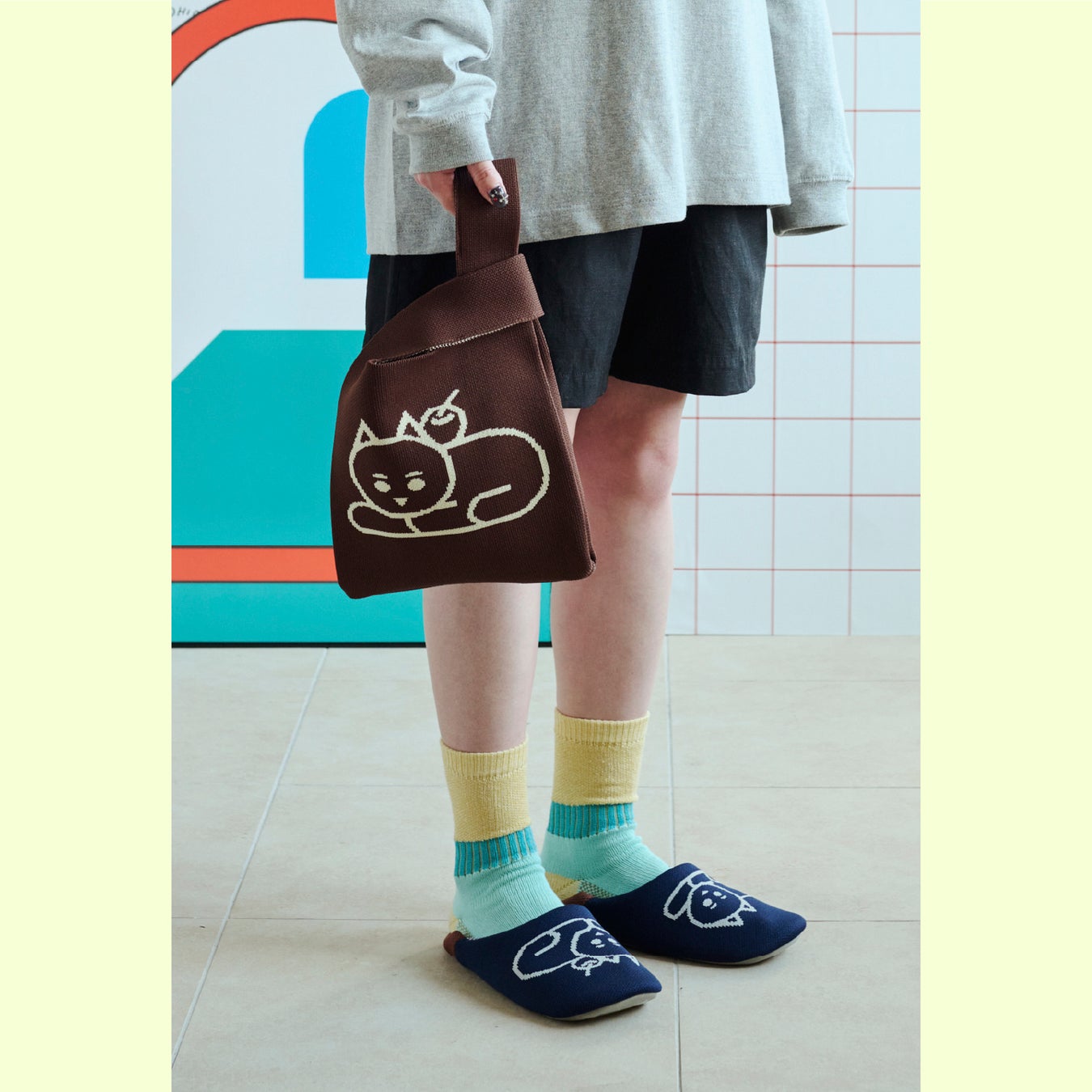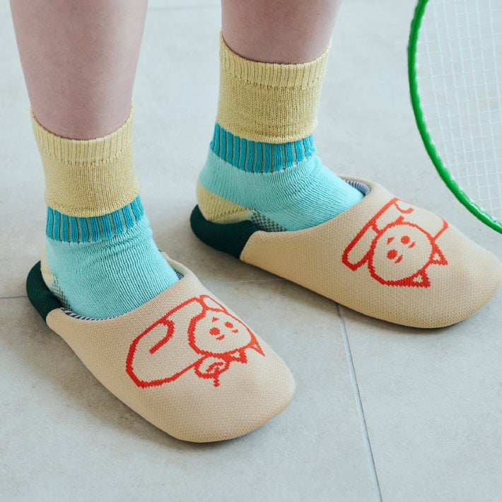ネコのイラストがかわいらしいニット素材のバブーシュ。