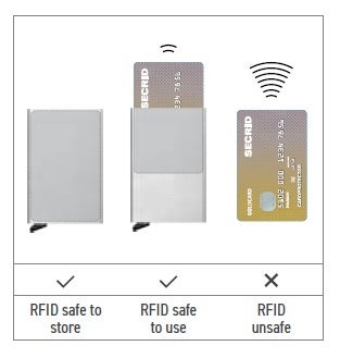 最新世代の銀行カード、クレジットカード、IDカードには、無線通信を可能にするRFIDチップとアンテナが装着されています。(RFID = Radio Frequency Identification)非常に便利ですがRFIDカードは遠距離からスキャンやスキミングされる可能性があるため、リスクも伴います。気づかないうちに個人情報やお金が盗まれるということが起こり得ます。RFIDカードを完全にCardprotectorの中に入れておけば、無線通信がブロックされ、カードが完全に保護されます。カードを30mm引き出した場合、無線信号は弱く近距離での通信は使用可能です。