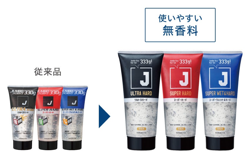2001年の発売以降、ヘアジェル市場で好調なJジェルシリーズ。ヘアジェルへビーユーザーのニーズに応え、強みであるセットの持続性を強化し、容量も覚えやすい330g→333gに!若年ユーザーの使用意向も取り込み、シンプルで覚えやすい新パッケージで展開します。