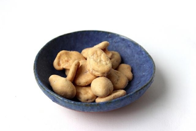 カレー空豆の粉の味が美味しいことと、寒梅粉(もち米の粉)で包まれたオーストラリア産の大粒の空豆が、歯ごたえと空豆の美味しさがとてもバランスが良いことから、シンプルな味付けでも美味しいのではないだろうかという案がでて、この度『しお空豆』を販売開始しました。