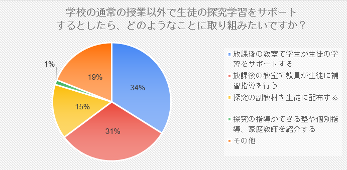 学校の通常の授業以外で生徒の探究学習をサポートするとしたら、どのようなことに取り組みたいかという質問には、「放課後の教室で学生が生徒の学習をサポートする」が最も多い34%で、「放課後の教室で教員が生徒に補習指導を行う」(31%)を上回りました。「探究の副教材を生徒に配布する」も15%で、教員が指導する以外の方法を希望する教員が多いことがわかりました。