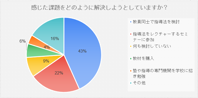「探究」を教えていて感じた課題をどのように解決しようとしているかという質問には、43%が「教員同士で指導法を検討」と最も多く回答が集まりました。「指導法をレクチャーするセミナーに参加」は22%いたものの、「塾や指導の専門機関を学校に招き勉強」は4%のみで、専門家などに指導のアドバイスを求めながらも学校の中でのサポートは限られていることが明らかになりました。