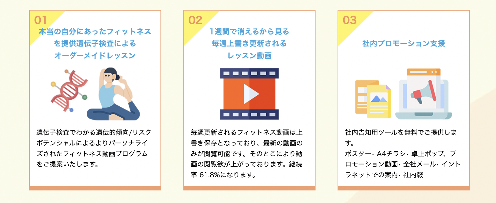 フィットネス動画のプラットフォーム「BeneFitness」の運営を手掛ける株式会社Alfree(所在地:東京都渋谷区、代表取締役:秋澤 幸太郎)は、遺伝子解析サービスを提供するジェノプランジャパン株式会社(本社:福岡県福岡市、代表取締役:金 武偉)、⾷習慣とメンタルヘルスの改善をサポートするBean Bros株式会社(本社:東京都港区、代表取締役:阿部 佑介)と3社間連携を図り、2022年 4 月 26日(火)に新サービス「BeneFitness x BeanBros」を開始いたします。