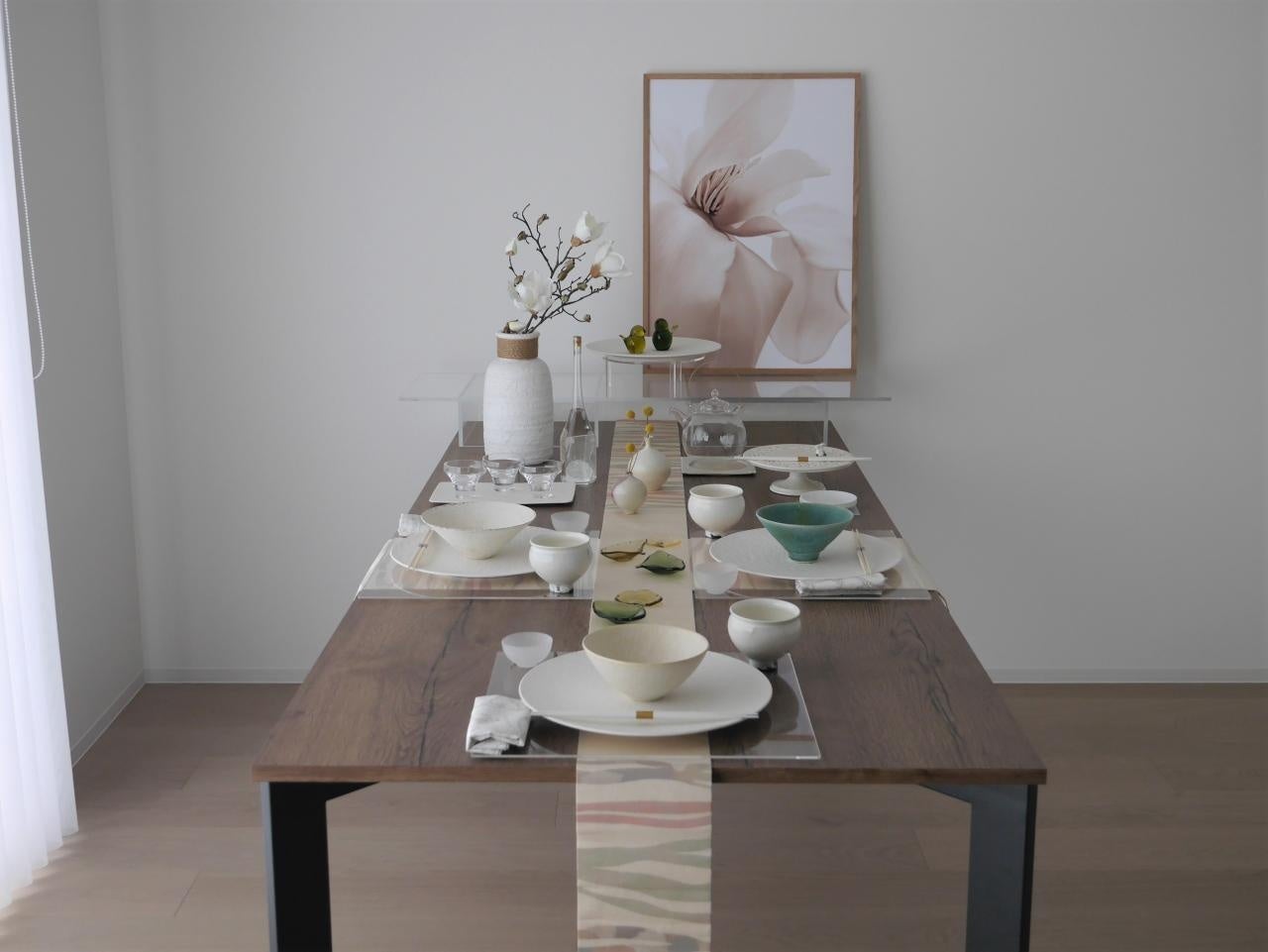 審査員評 :雲井を思わせる文様が美しい細身のランナーと少し巾広のランナーを交互に交差させ、すっきりとまとめた食卓は日本の伝統を思わせる、ずらしの美しさがある。器も少しずつ味わいのある色の変化を見せる。モダンな両細の箸はテクスチャーのある皿と相まってバランスが良く、中央のガラスの小皿は透明感のある美しい色を添えている。全体的に日本的でありながら、モダンな新しさと格のある食卓が完成した。