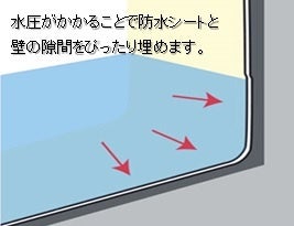 「空気は通すが、水は通さない」特殊加工のシートは、水圧がかかることで、シートと壁の隙間がぴったり埋まり、建物内への浸水を防ぎます。1,300mm程の水圧にも耐えられ、繰り返し使用も可能です。また、シートで覆っても室内の通気性を確保できます。