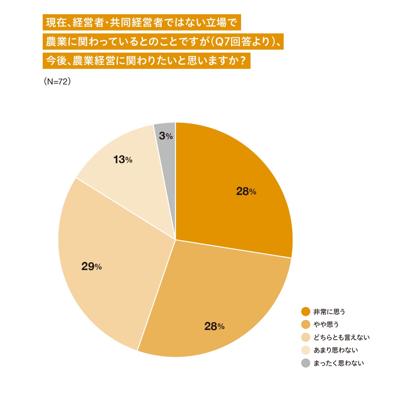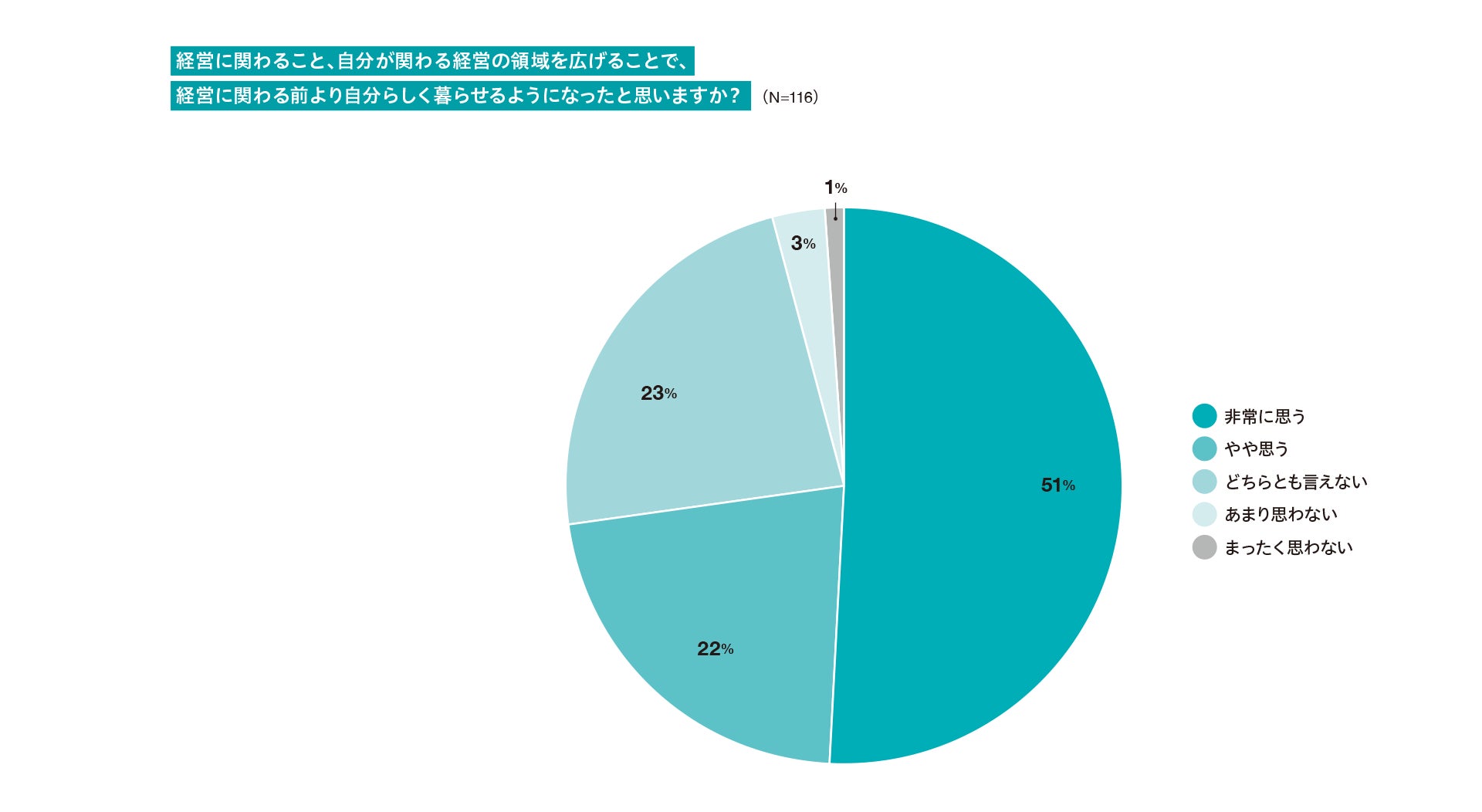 また、現在経営者、または共同経営者として農業に携わっている方に「経営に関わること、自分が関わる経営の領域を広げる前より自分らしく暮らせるようになったと思うか」の質問には、7割以上が「そう思う」と回答しました。