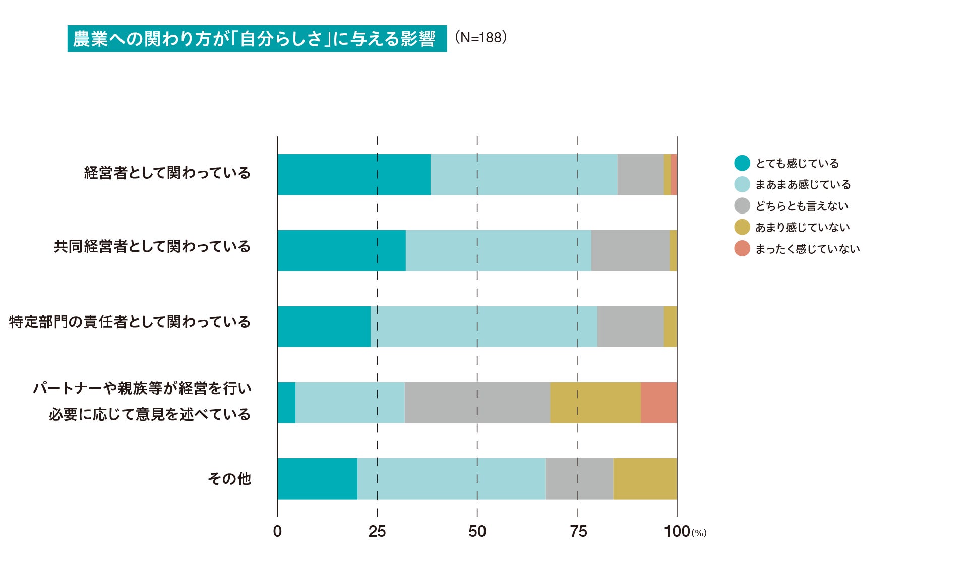 さらに、現在の農業経営への関わり方と、「自分らしく暮らせている」と感じている度合いをクロス集計したところ、「とても感じている」の割合が最も高いのは「経営者として関わっている」、次いで「共同経営者として関わっている」「特定部門の責任者として関わっている」が続き、最後に「パートナーや親族等が経営を行い、必要に応じて意見を述べている」となっており、農業経営への関与度が上がるほど、「自分らしく暮らせている」と感じる女性農業者の割合が高まることがうかがえる結果となりました。