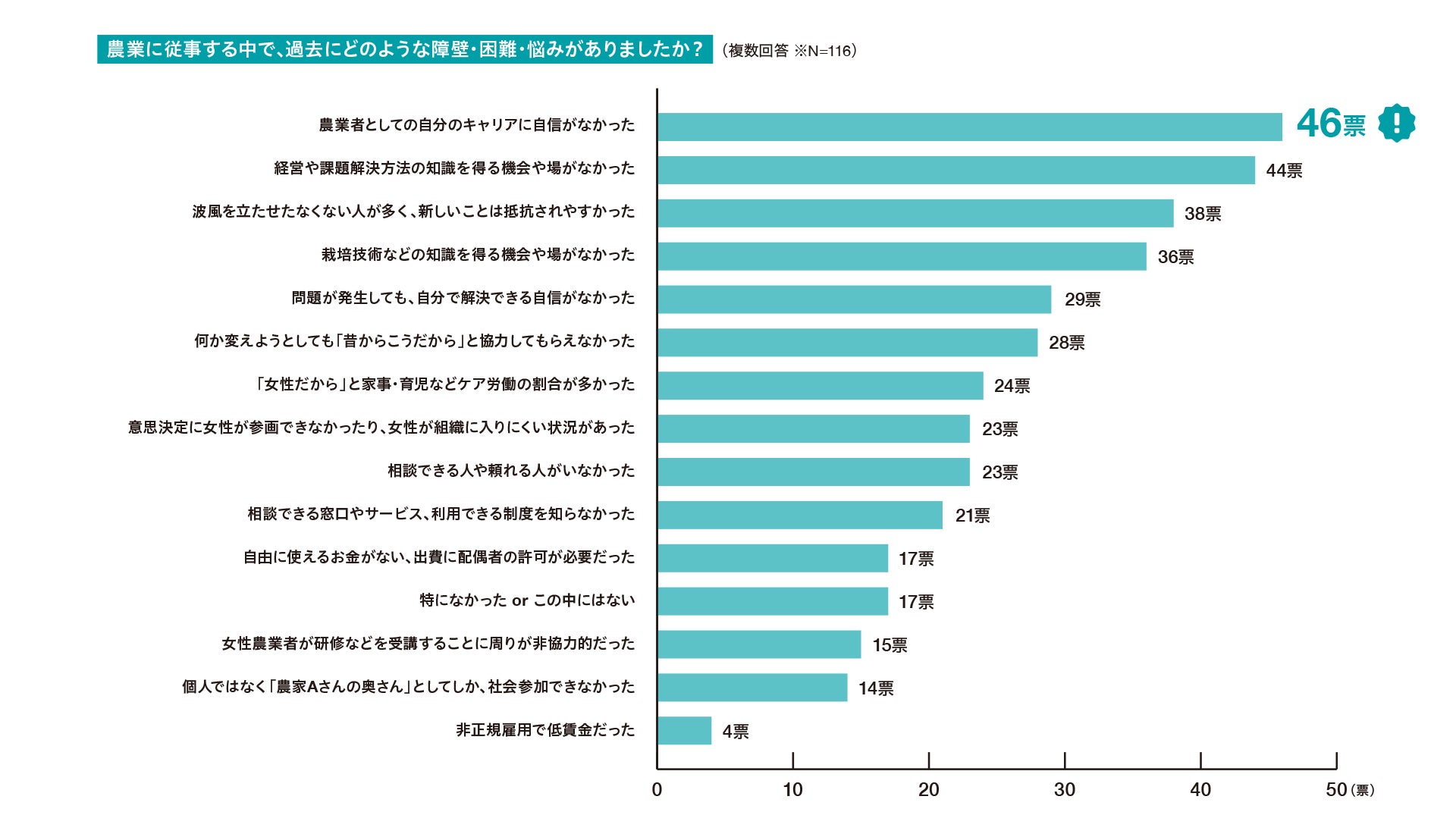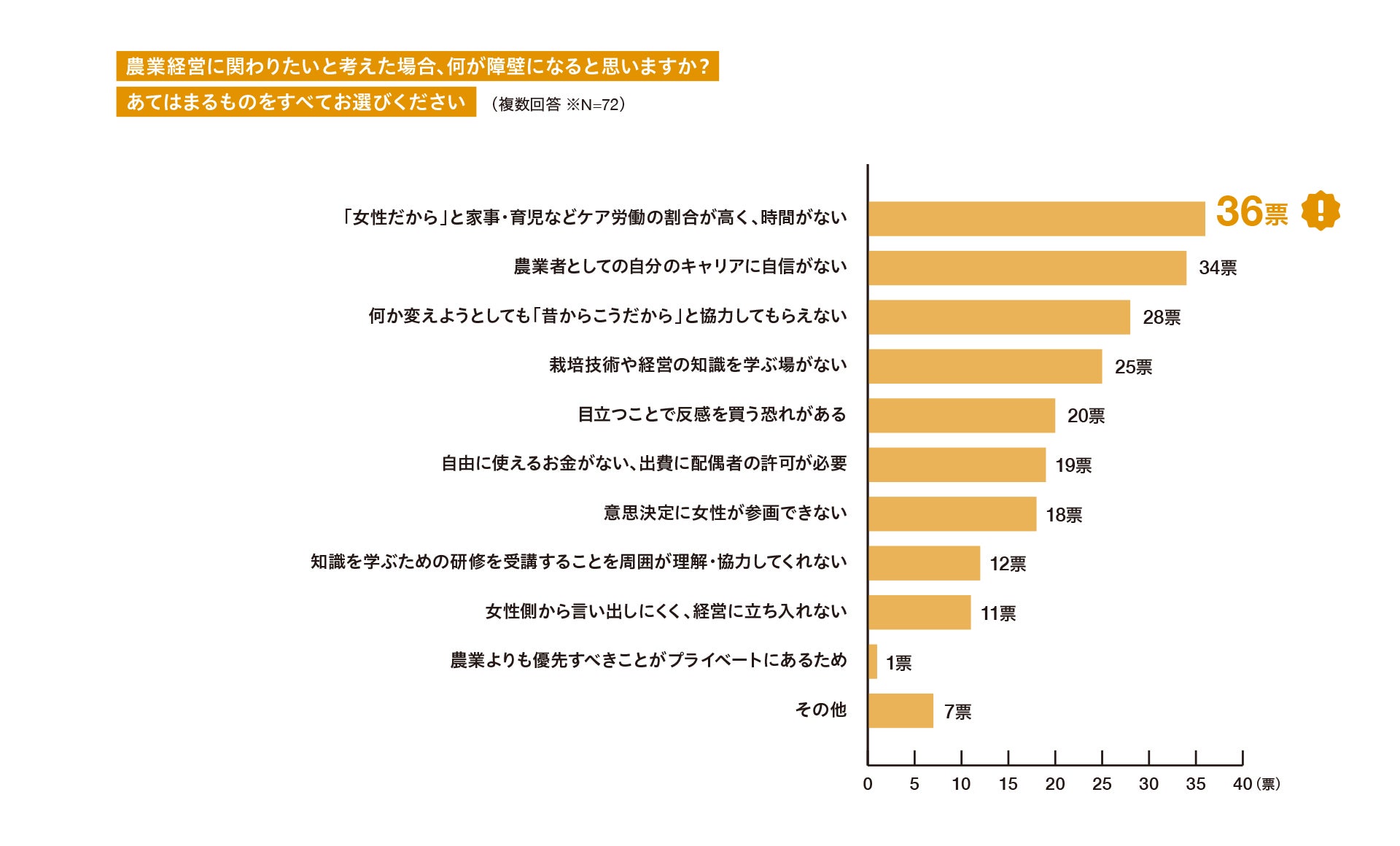 その際に「何が障壁になると思いますか」という質問(複数回答可)には、「『女性だから』と家事・育児などケア労働の割合が高く、時間がない」と回答した方が50%にのぼり、次いで「農業者としての自分のキャリアに自信がない」が47%と、ケア労働の負担と、自信の無さが大きな障壁となることが明らかになりました。